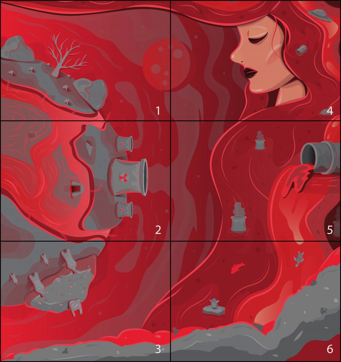 Bài dự thi bao gồm 2 bộ ảnh gồm 12 tấm hình đơn lẻ. Bộ ảnh 1 gồm 6 ảnh đơn nói về hậu quả và bộ ảnh 2 gồm 6 ảnh đơn nói về giải pháp bảo vệ môi trường. Đồng thời mình muốn đem lại cách xem tranh thú vị bằng cách kết hợp các mảng tranh với nhau để thấy được sự tương phản, so sánh, trọn vẹn, hấp dẫn.