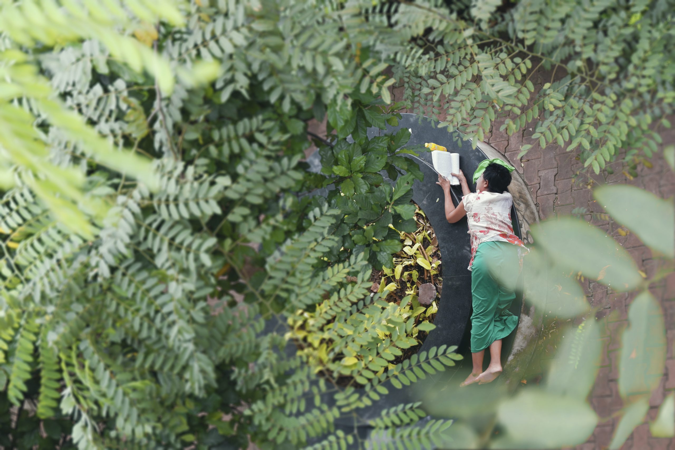 Đây là 1 bức ảnh em chụp ngẫu hứng khi đang đi trên cầu calmette, nhìn xuống cầu là 1 công viên xanh, vốn là nơi mọi người tập thể dục hay cũng là nơi ở tạm bợ của những người vô gia cư đi nay mai đó, vốn cũng là nơi đầy phức tạp. Nhân vật trong ảnh không thấy mặt, nhưng qua làn da nâu rám nắng và trang phục cũ kĩ, khung cảnh, em thoáng nghỉ đây là 1 cô bé nghèo đang nằm nghỉ ngơi, cô bé đang nằm đọc sách trên bục cây với chiếc nón tựa như 1 chiếc gối, xung quanh cô bé là những nhánh cây xanh bao bọc che mát. “Chiếc giường đọc sách” vốn là hình ảnh quen thuộc của những đứa trẻ đang đọc sách trên giường, những mầm non đang tiếp thu những kiến thức mới, nhưng hình ảnh này lại bất ngờ xuất hiện trong khung hình đường phố, trong cuộc sống bình dị của những ai không may mắn.