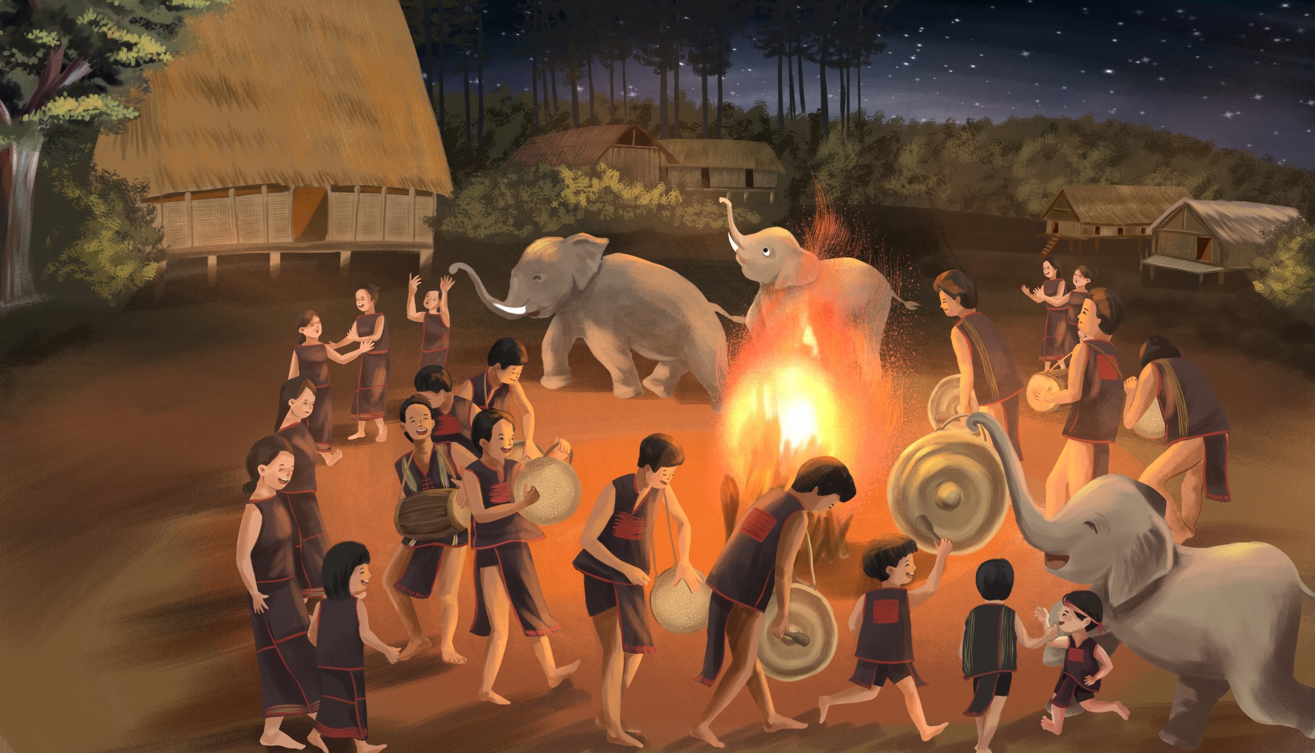 Văn hóa Việt nói chung và văn hóa ăn mừng bằng cồng chiêng nói riêng của người Ê Đê với tôi là một trong những chất liệu tuyệt vời nhất để người họa sĩ có thể thăng hoa trên tác phẩm của mình. Tôi hy vọng có thể truyền tải được những ánh lửa bập bùng, những vũ điệu Xoan uyển chuyển và cả không khí tươi vui, hào sảng vang vọng của người dân nơi đây vào trong từng nét vẽ.
