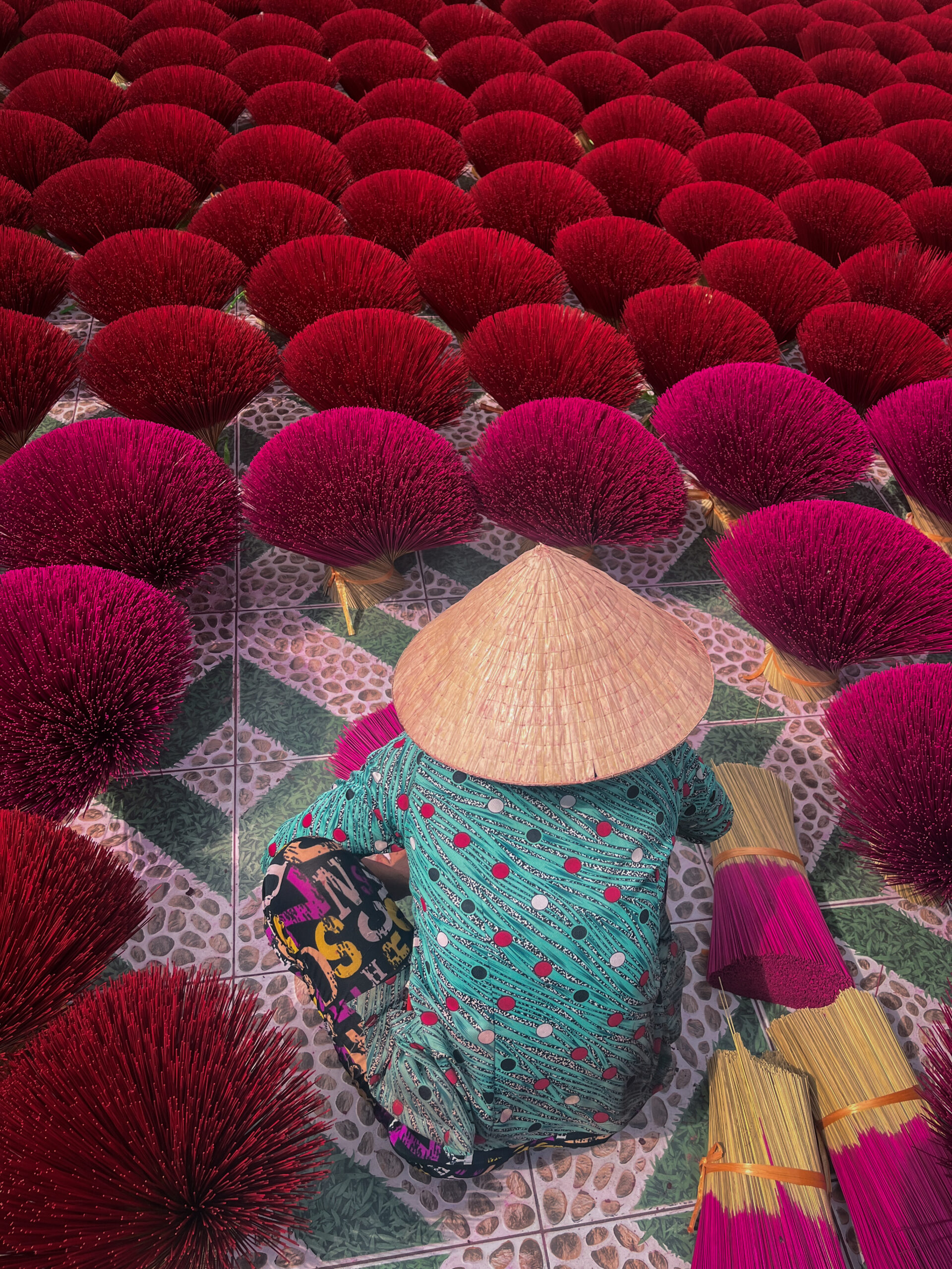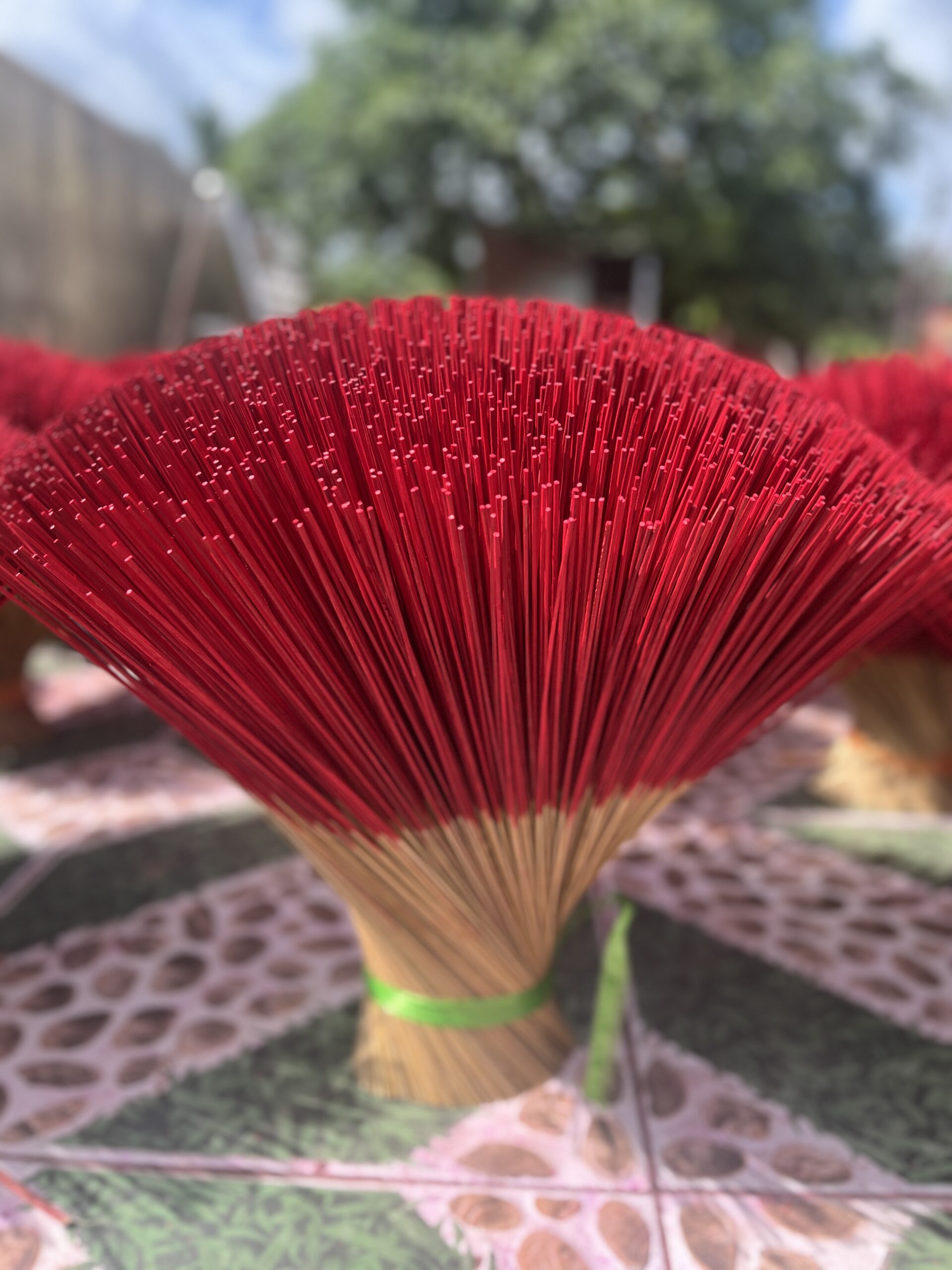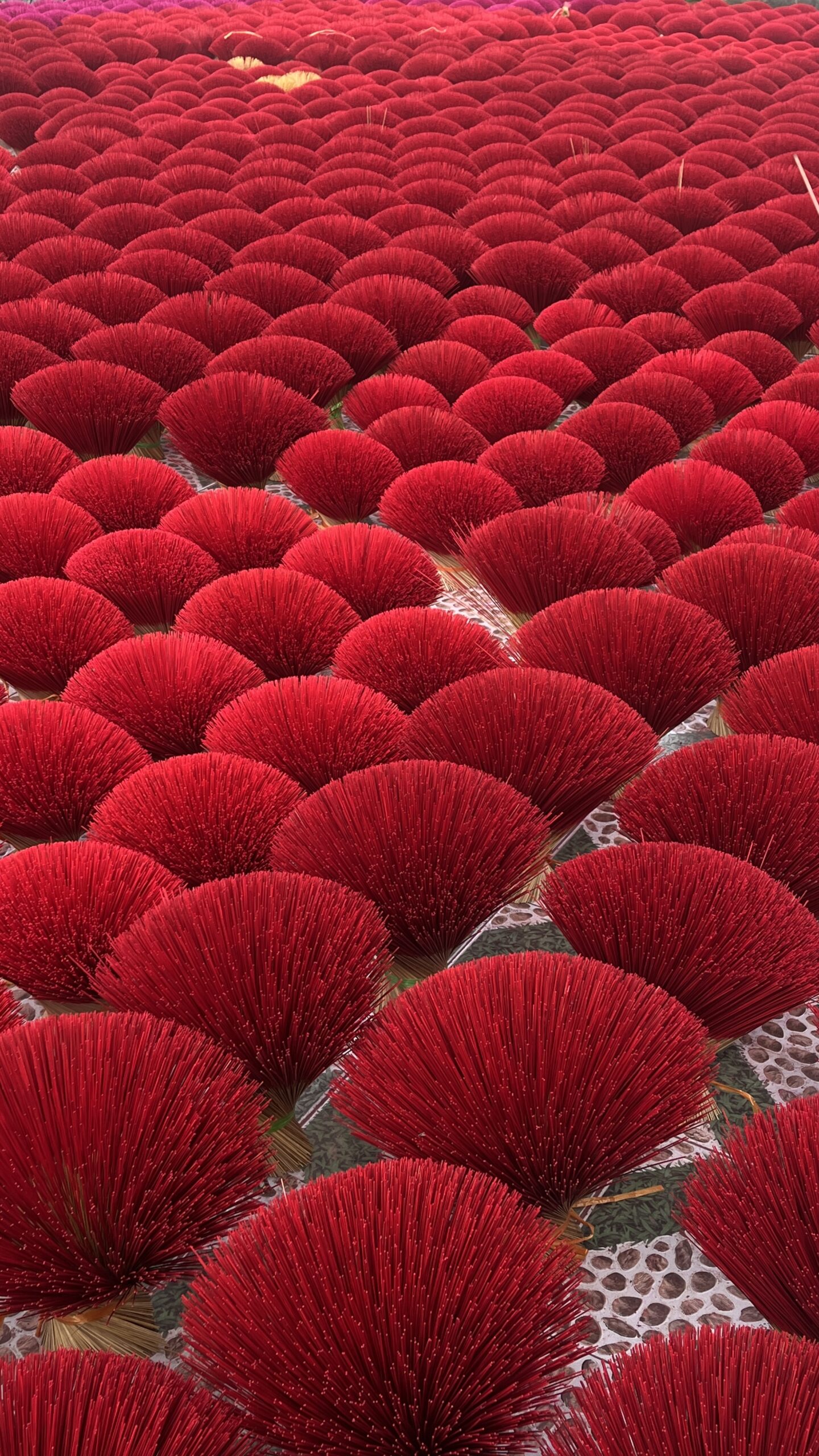 Đến với tác phẩm hôm nay, mình xin giới thiệu về một làng nghề truyền thống khá là lâu đời nhưng dường như đang bị lãng quên trong cuộc sống của chúng ta, đó là làng nghề làm nhang. Ở huyện Bình Chánh, trên con đường Lê Minh Xuân, có một làng nghề bấy lâu nay vẫn được các cô, các chú âm thầm lặng lẽ duy trì. Làm nhang là một nghề có lẽ khi nghe đến chúng ta sẽ vừa cảm thấy gần gũi vừa cảm thấy xa lạ, giữa những sự phát triển của công nghệ tân tiến, những làng nghề giản dị và truyền thống này đã dần dà không còn được các bạn trẻ quan tâm và chú ý, ở các hộ lân cận ở trên đường Lê Minh Xuân, nghề làm nhang cũng đã dần dần thoái trào, và mọi người đều chọn công việc ổn định hơn. Tuy nhiên ở đó vẫn tồn tại vững chắc một xưởng nhang tên là Minh Phước, đây có lẽ là cơ sở làm nhang lâu đời và bền bỉ nhất ở miền Nam hiện nay, mình may mắn được ghé thăm xưởng nhang trong một dịp xuống nhà bạn chơi ở Bình Chánh, các cô chú trong xưởng nhang làm việc theo một hệ thống và dây chuyền nhất định, từng bó nhang đỏ thắm được các cô chú xếp tròn trên sân phơi, bung tỏa tròn đều mà mình liên tưởng như là những chùm “Pháo Hoa Đỏ” đang nở rộ giữa nắng. Nơi đây không chỉ lưu giữ kỹ nghệ se nhang đã tồn tại hàng chục năm, mà còn là hơi thở văn hoá tâm linh của người Việt. Dù ngày nay nhiều công đoạn đã có máy móc hỗ trợ, nhưng dấu ấn thủ công, sự tỉ mỉ và niềm tin gửi gắm trong từng cây nhang vẫn khiến làng nghề trở thành biểu tượng độc đáo – nơi quá khứ và hiện tại giao thoa trong sắc đỏ rực rỡ, ấm áp lòng người.
