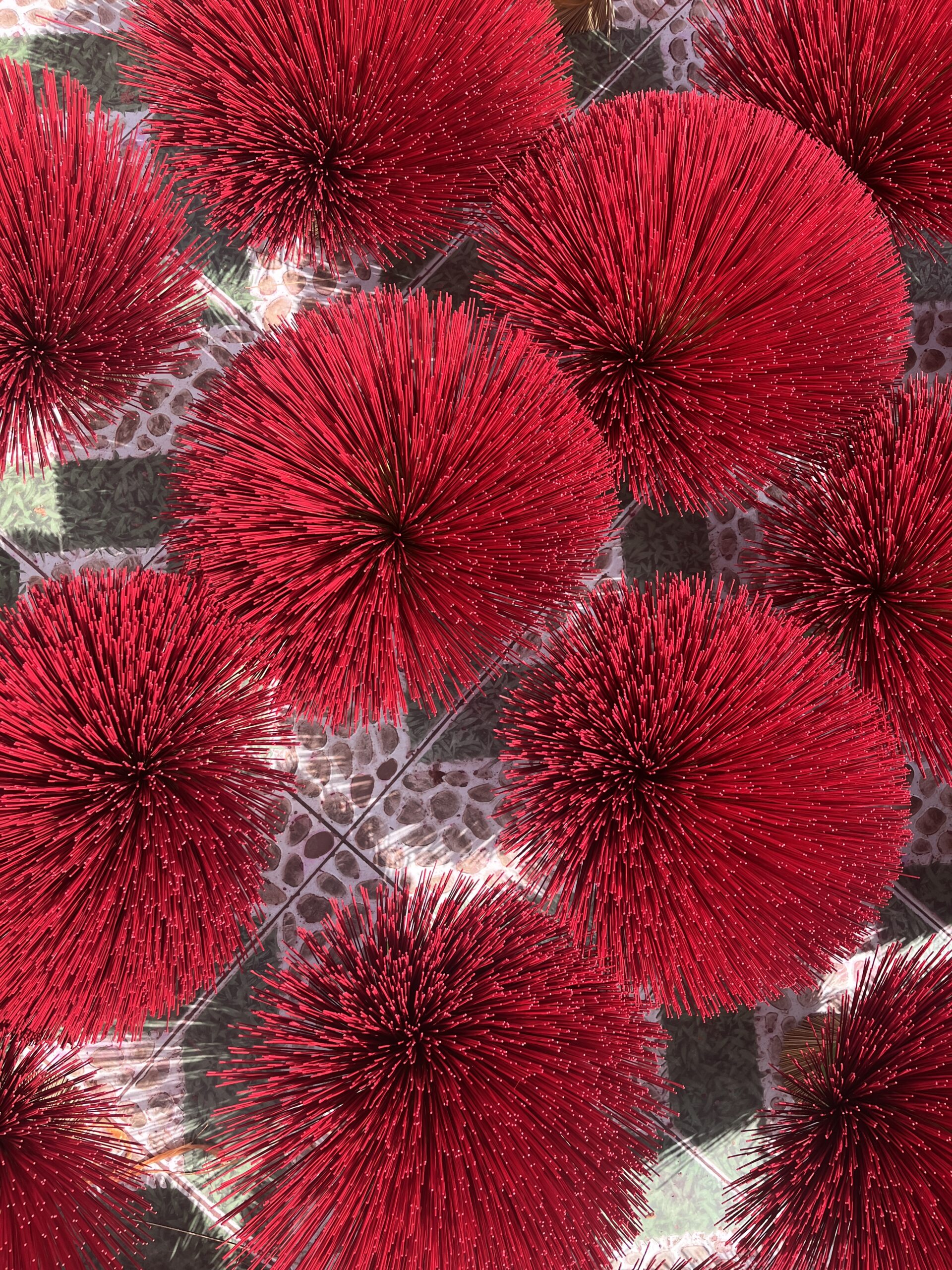 Tác phẩm 1: Là “rừng Pháo Hoa Đỏ” bao la do mình đứng giữa sân chụp, các cô chú đem nhang đã sấy khô và được buộc lại thành từng bó riêng biệt chắc chắn ra sân phơi từ sáng sớm, những bó nhang được các cô chú dựng đứng và xòe ra đồng đều tạo thành một biển “Pháo Hoa Đỏ” bao la.