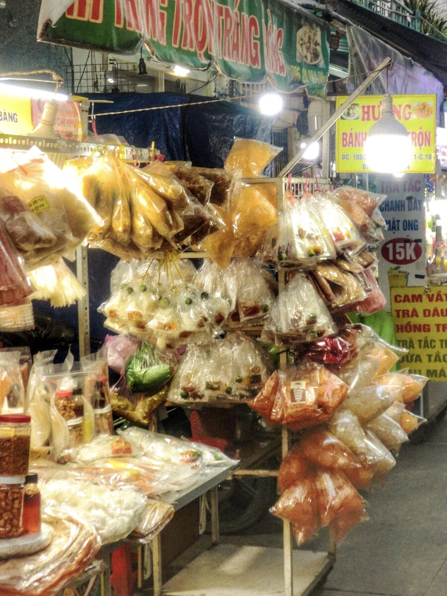 Tác phẩm 1: Phố ăn uống Hồ Thị Kỳ là thiên đường của những tín đồ mê đồ ăn vặt. Dọc con hẻm nhỏ, những gánh hàng chen nhau, túi bánh tráng đầy màu sắc treo lơ lửng, thu hút từng ánh nhìn.