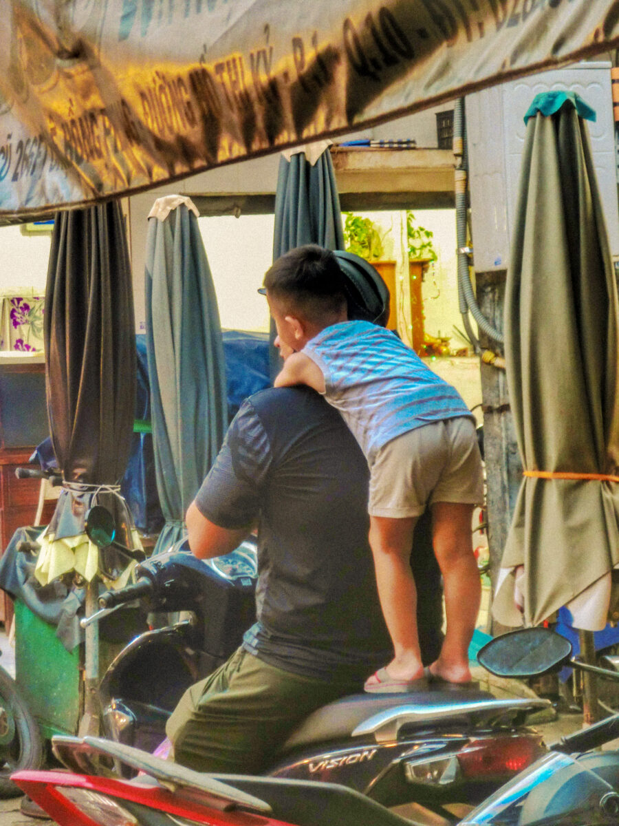 Tác phẩm 5: Hình ảnh người cha chở con nhỏ trên xe máy gợi lên vẻ bình yên giữa nhịp sống hối hả.