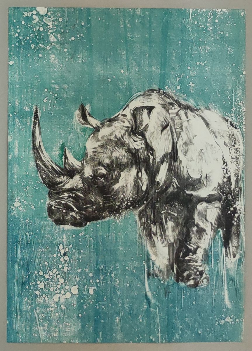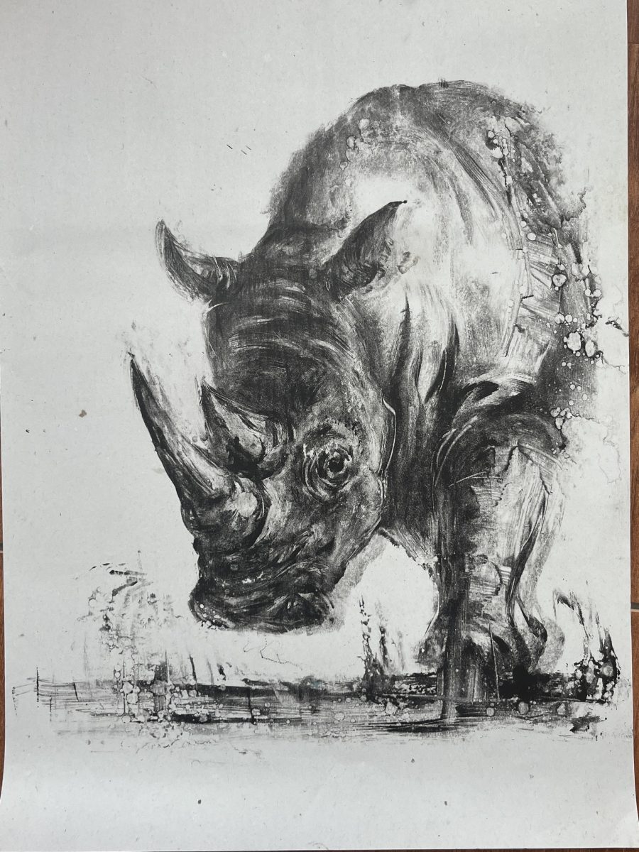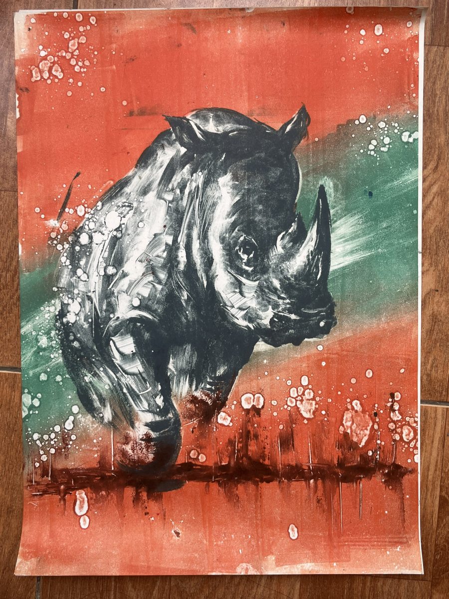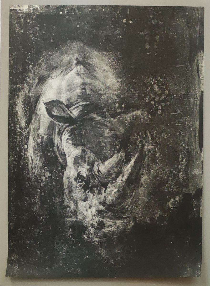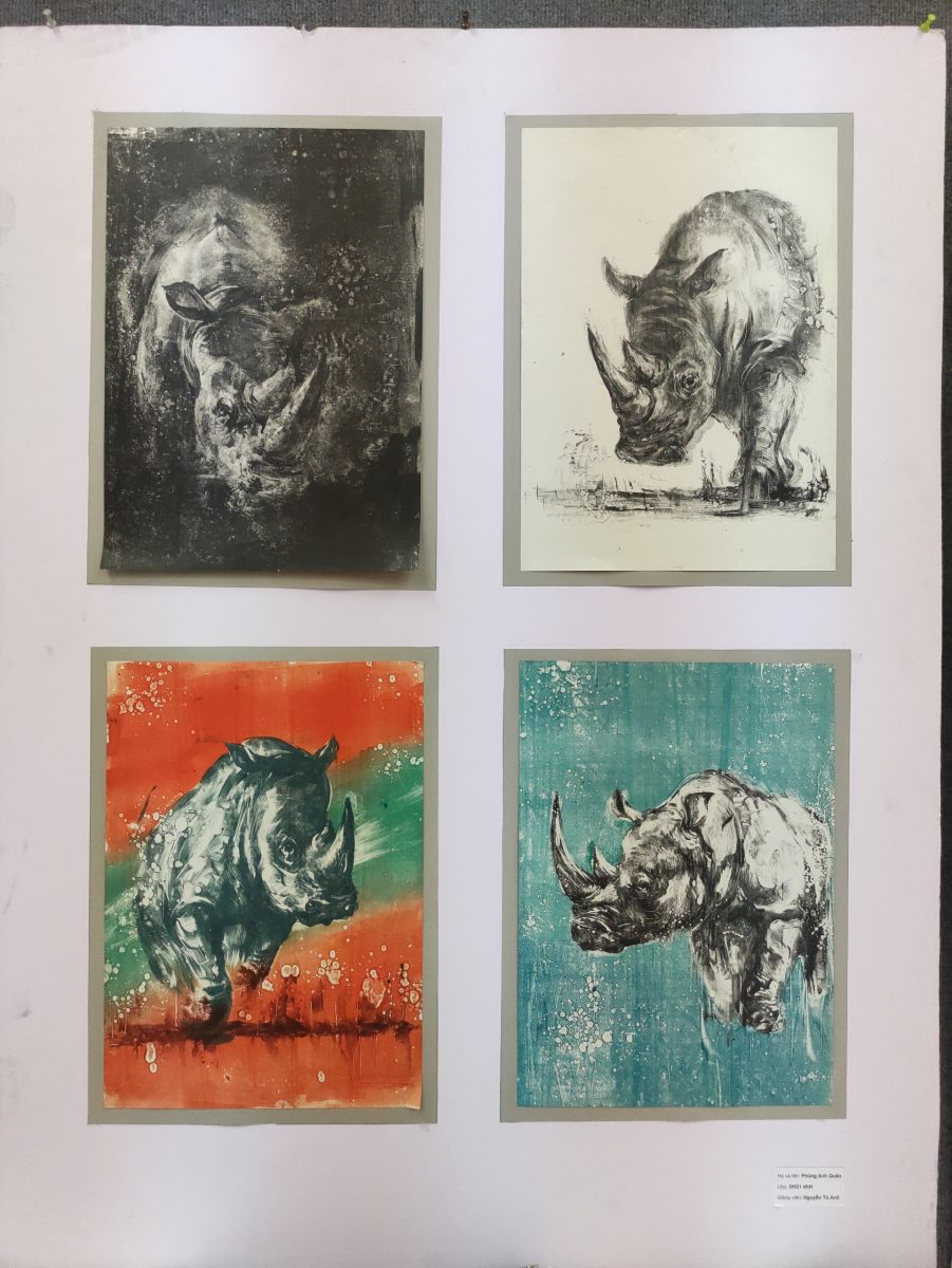 Bộ 4 tác phẩm lấy cảm hứng từ tê giác trắng – một trong những loài động vật có thể sẽ biến mất bởi sự săn bắt quá tay đến từ con người. Tác phẩm của em hướng đến sự bảo tồn những thứ cuối cùng, những điều còn sót lại duy nhất, hình ảnh tê giác cũng không được vẽ một cách trọn vẹn, mong muốn gợi nhớ cho con người rằng có thể một thời gian sau chúng sẽ không còn tồn tại nữa, và rất nhiều loài khác ngoài kia cũng sẽ giống tê giác trắng cũng dần tan biến bởi chính bàn tay của con người. Sự đượm buồn, thay cho lời cầu khẩn chính là những ý nghĩa em muốn gửi gắm vào trong ánh mắt của những con tê giác trắng trong tác phẩm này. Cuối cùng em mong muốn tác phẩm sẽ giúp mọi người nhận ra khi chúng ta hủy hoại môi trường tự nhiên cũng là đang xóa dần đi sự tồn tại của bản thân chúng ta.
