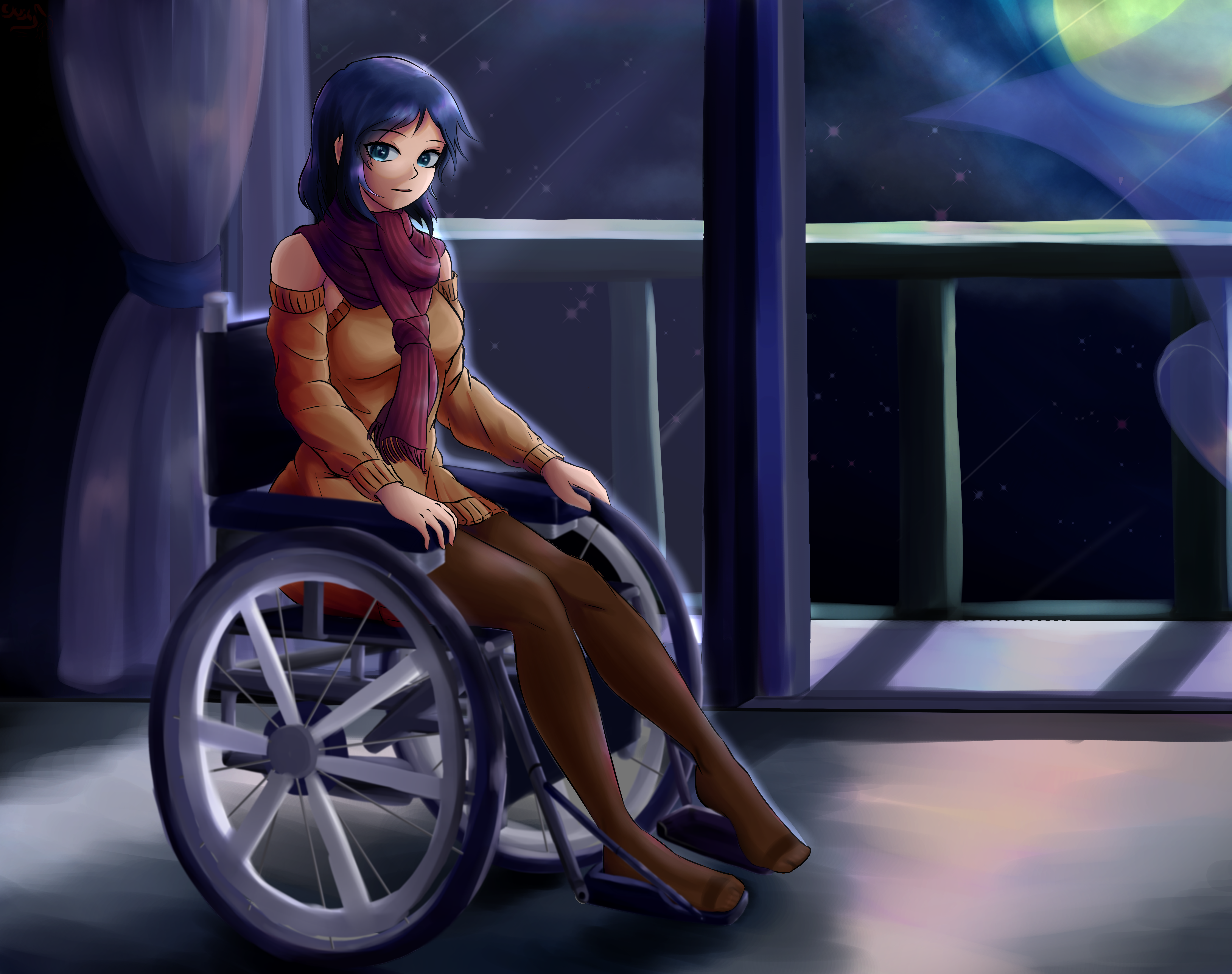 Bài này em tạo ra với nhân vật chính là một cô bé bị tật chân bẩm sinh, phải ngồi xe lăn. Với color palette màu chính là xanh đen tạo nên sự cảm giác tối nhưng kết hợp với các gam màu sáng nhất là hình ảnh sáng của mặt trăng tạo cảm giác ấm áp, hy vọng.