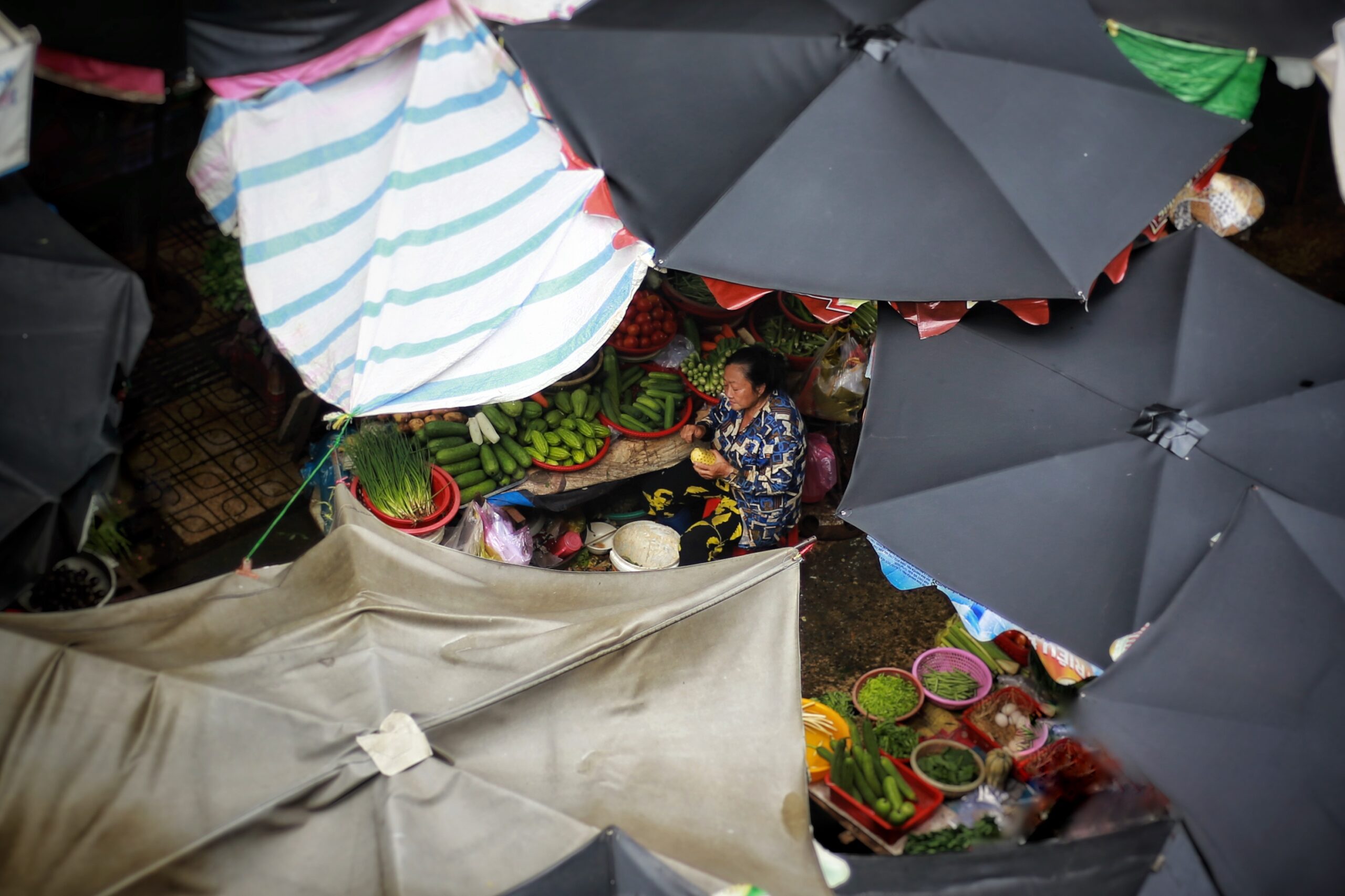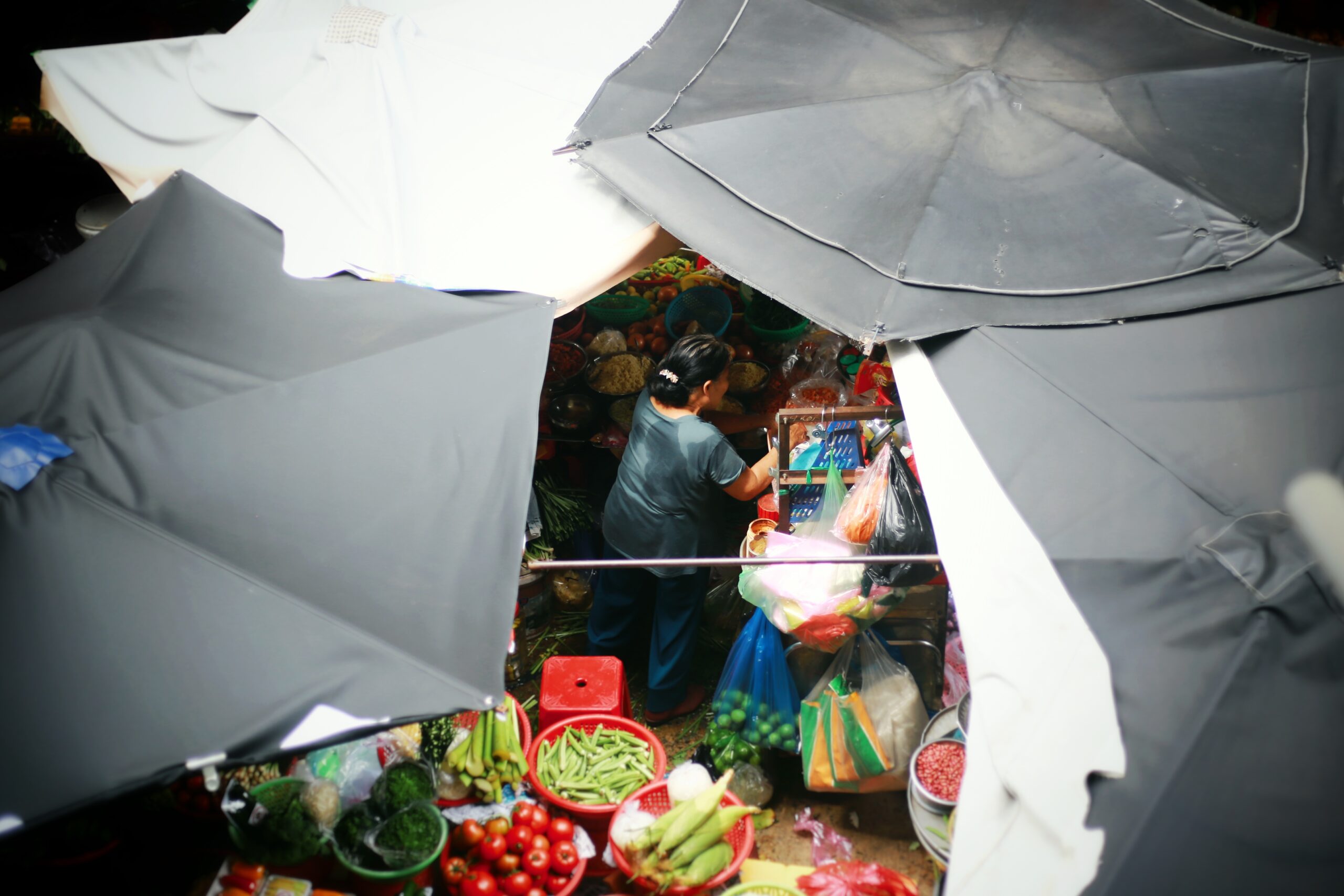 Tác phẩm 2 và 3: Mình đứng trên cao, dùng mấy cái dù che khung lại cảnh phía dưới, như là nhìn qua một cửa sổ; cái mình muốn thấy là người phụ nữ đang cặm cụi làm việc, giữa mớ rau củ xanh đỏ rực rỡ được ánh sáng hắt vào.