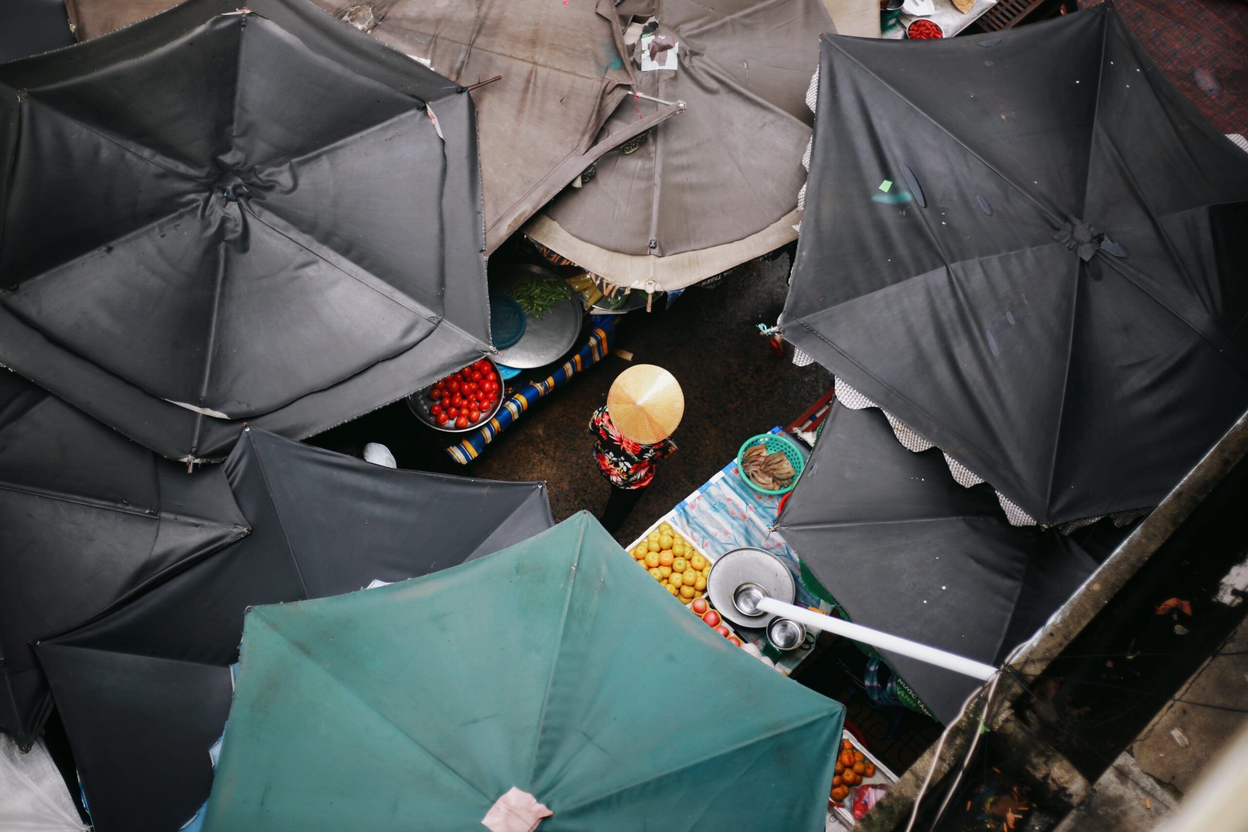 Tác phẩm 4: Đây là lúc mình chơi với hình khối: mấy cái dù đen sậm, to đùng đối chọi với chiếc nón lá tròn, nhỏ xíu ở giữa, chỉ muốn làm nổi bật sự thanh thoát của người lao động giữa cái lộn xộn của chợ.