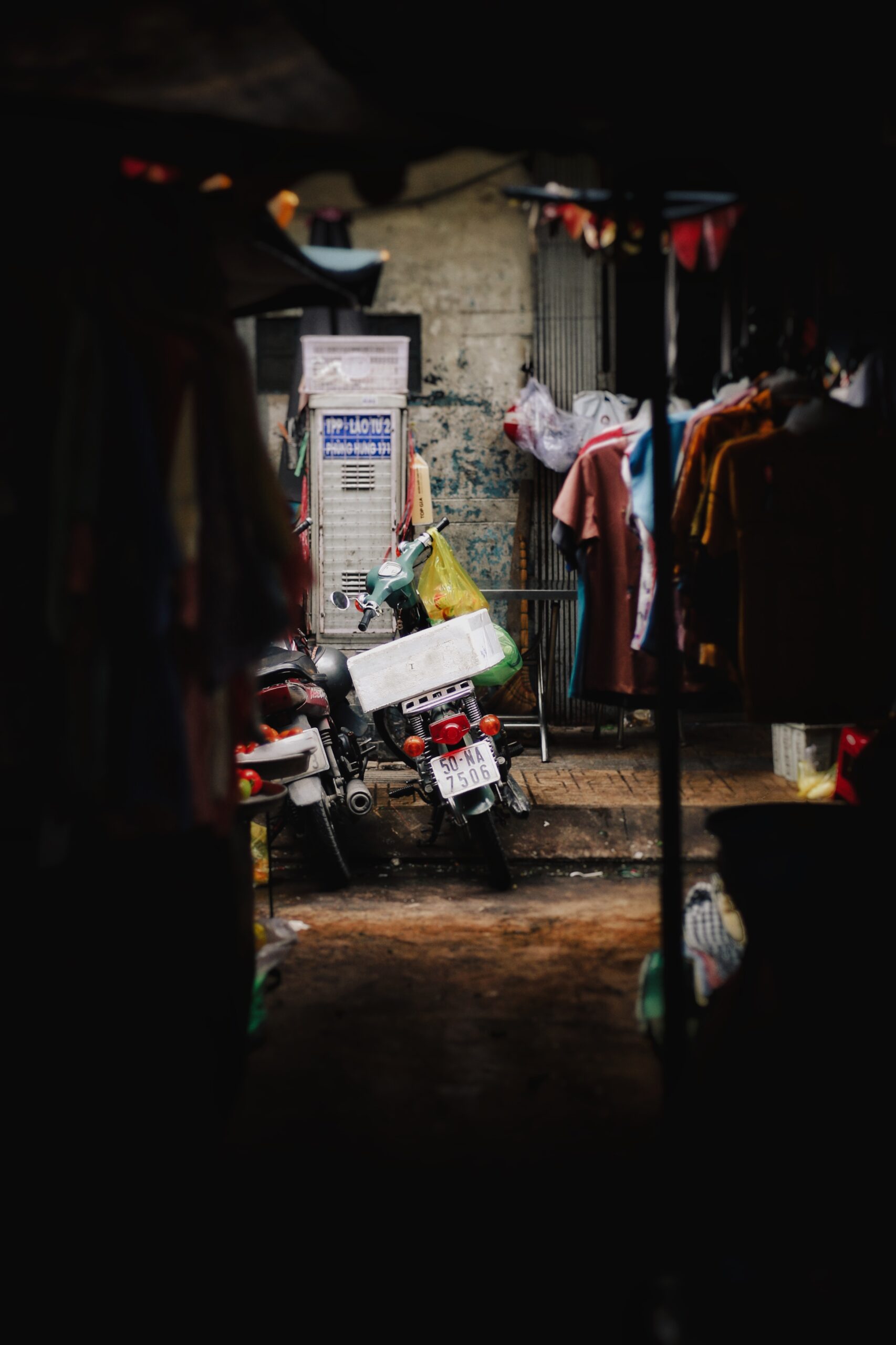 Tác phẩm 5: Mình lùi ra xa một chút, đứng trong bóng tối, để khung lại cái lối đi này; mình muốn cho thấy cuộc sống thực ở bên ngoài sạp hàng, với chiếc xe máy và bức tường cũ kĩ, nơi người ta tạm gác lại việc bán buôn.