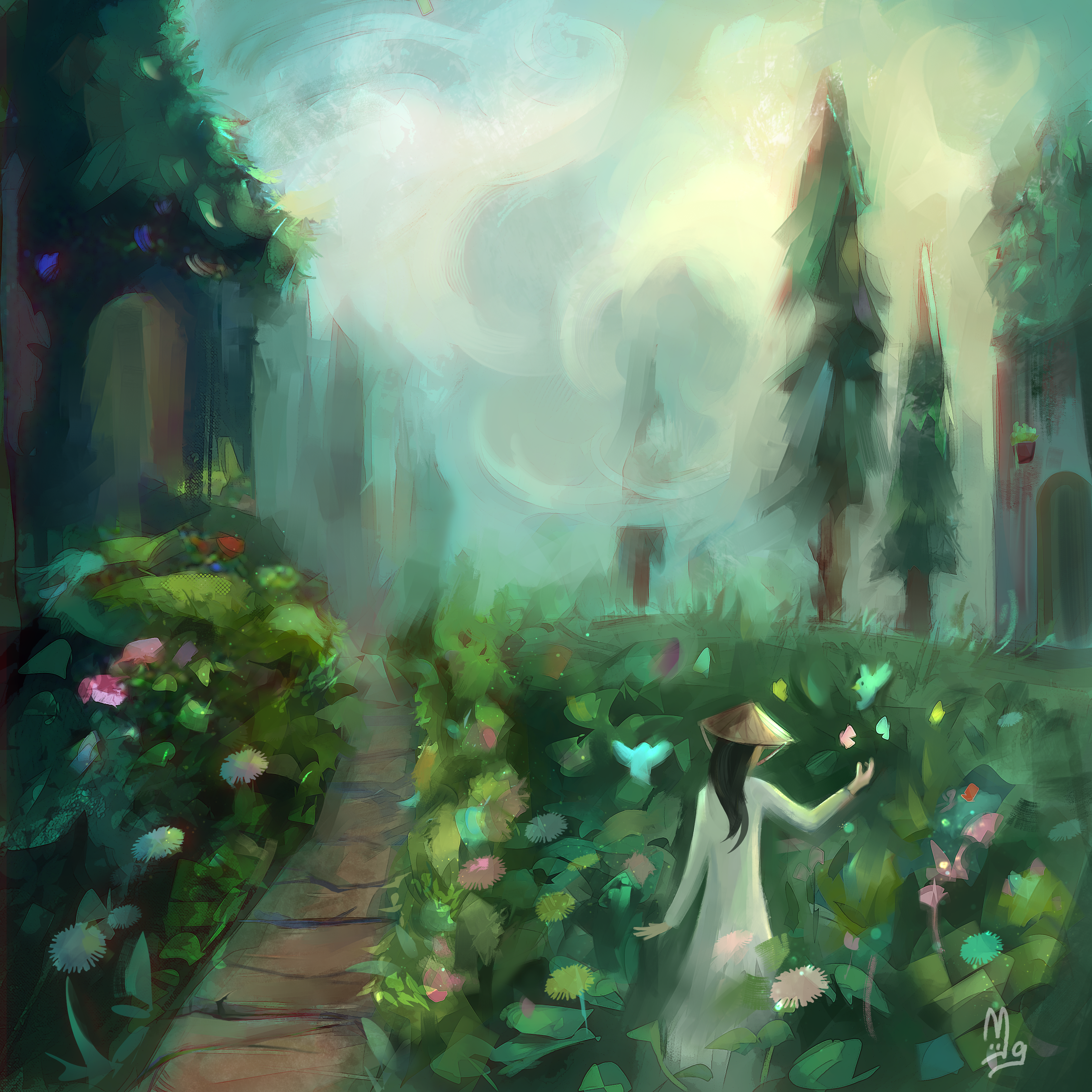 Đây là tác phẩm mang màu sắc xanh của khu vườn cũng như không khí trong xanh. Điểm nhấn là cô gái với bộ trang phục truyền thống là áo dài của Việt Nam đang chơi đùa cùng chim và bướm trong khu vườn. Tác phẩm muốn tôn vinh vẻ đẹp thanh thoát của người phụ nữ Việt Nam trong áo dài và sự thanh thoát của họ, hòa mình trong vẻ đẹp của thiên nhiên.