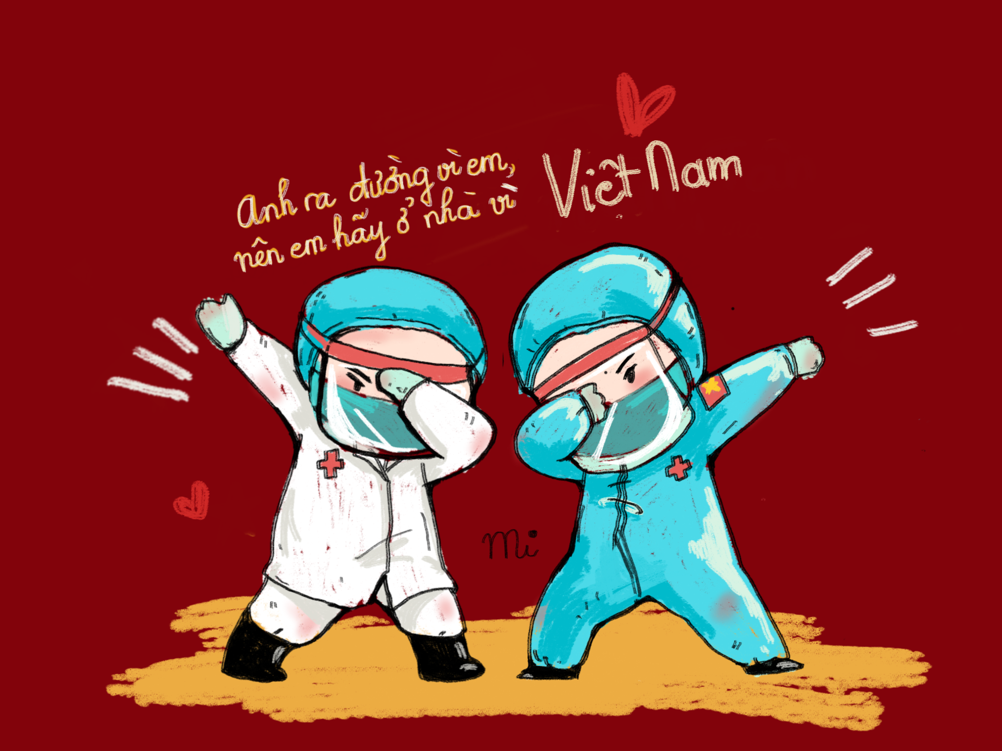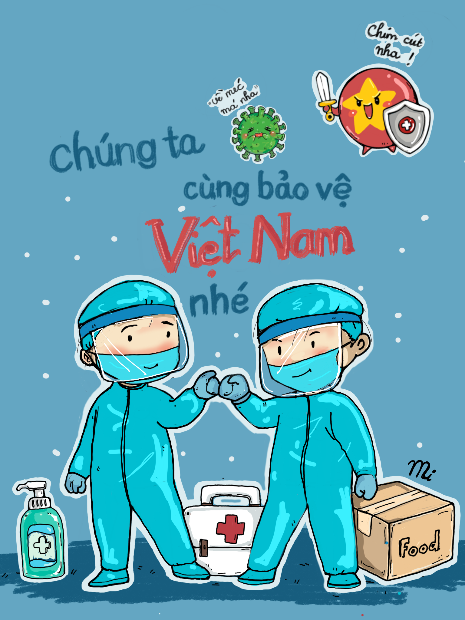 Nội dung bức tranh muốn cổ vũ và cảm ơn những người anh hùng đã ra sức, bỏ cả gia đình, để cùng người dân đồng lòng chống dịch. Cảm ơn những đóng góp to lớn ấy của những anh hùng tuyến đầu.