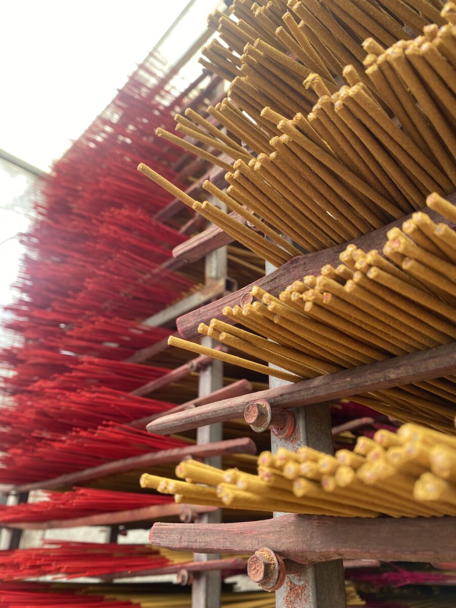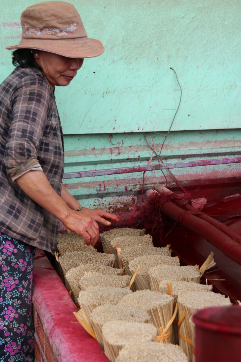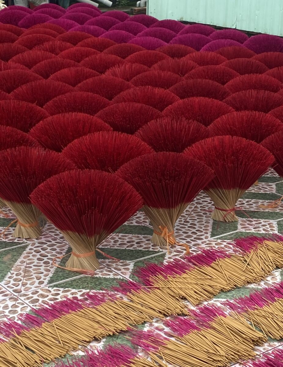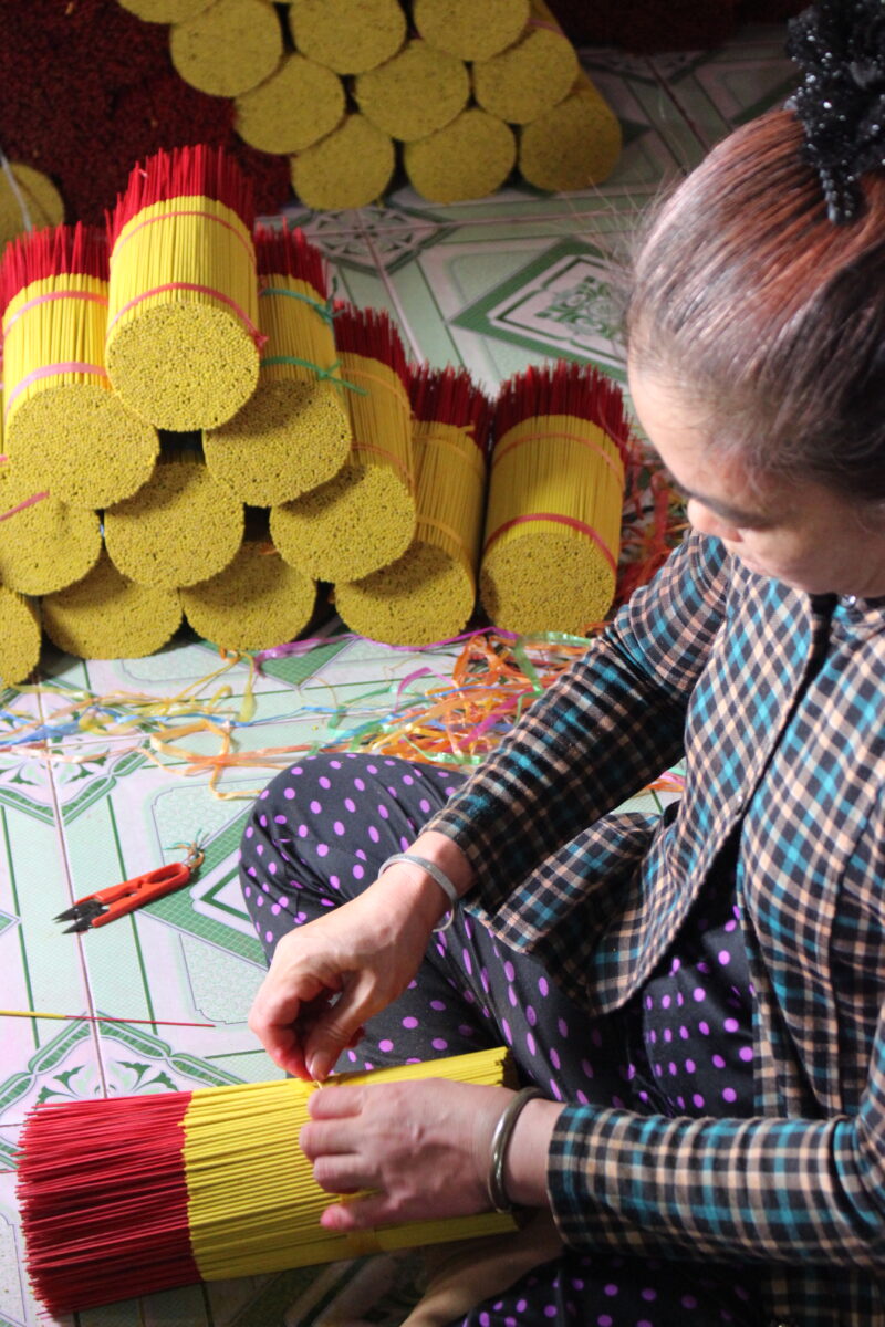 Những bức ảnh ghi lại khoảnh khắc lao động bình dị tại làng nhang truyền thống ở Bình Chánh. Giữa không gian rực rỡ sắc vàng, đỏ, hồng của những bó hương xếp ngay ngắn, bàn tay khéo léo của người thợ vẫn miệt mài vun vén từng tăm hương, gói ghém trong đó cả tâm huyết và niềm tự hào về nghề tổ. Dưới ánh sáng tự nhiên, màu sắc của hương không chỉ tượng trưng cho sự thanh tịnh mà còn là biểu tượng của văn hóa tâm linh Việt, nơi con người luôn hướng về cội nguồn, về những giá trị tinh thần thiêng liêng. Bộ ảnh là lời tri ân dành cho những con người thầm lặng vẫn ngày ngày “giữ lửa” cho làng nghề, để hương Việt tiếp tục lan tỏa, để những giá trị truyền thống mãi được gìn giữ và tỏa sáng trong nhịp sống hiện đại hôm nay.