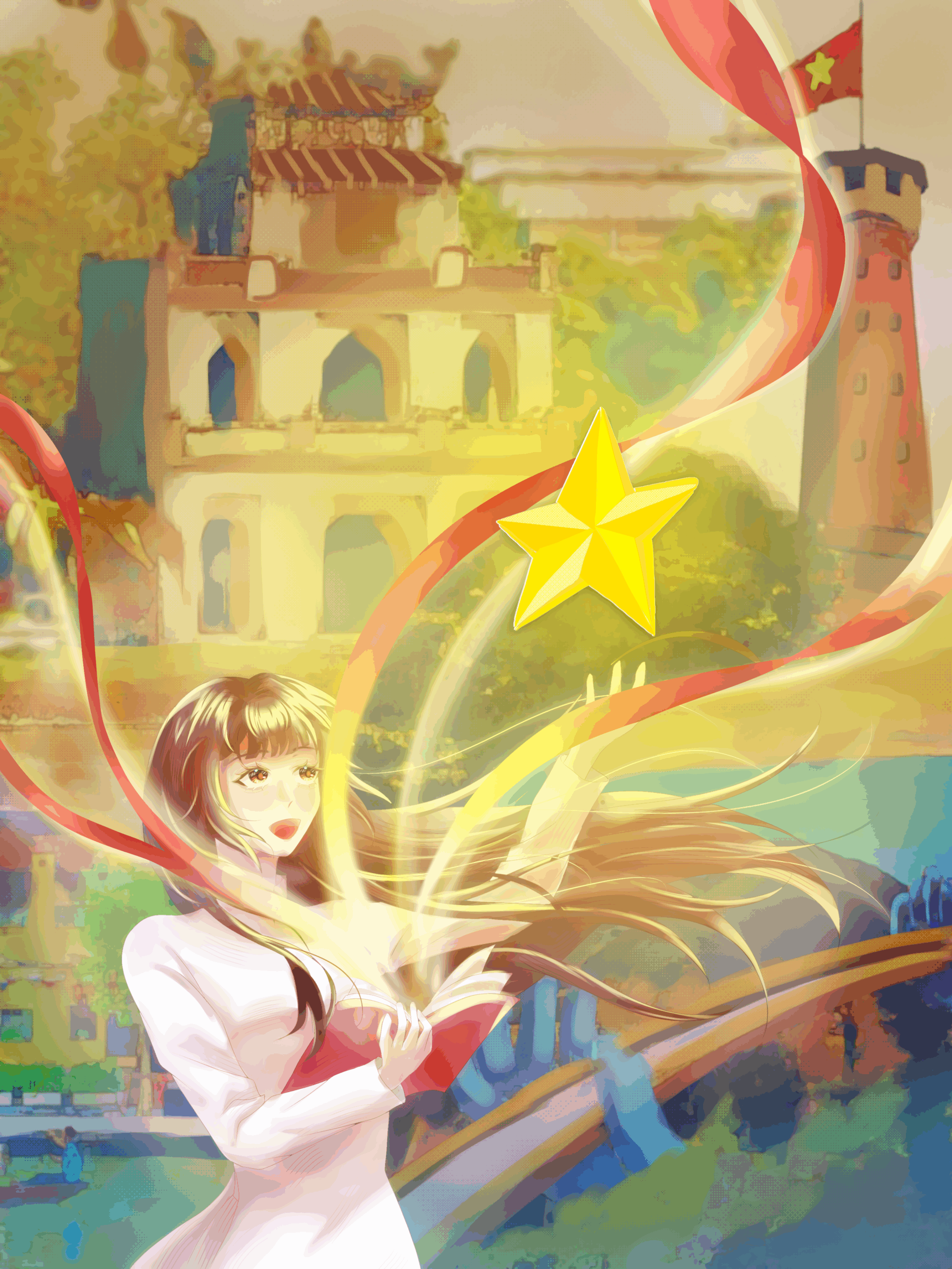 Tác phẩm “Sắc Việt” lấy cảm hứng từ vẻ đẹp văn hóa và tinh thần hiếu học của con người Việt Nam. Hình ảnh cô gái trong tà áo dài nâng niu ngôi sao vàng tượng trưng cho tri thức, niềm tin và khát vọng vươn lên của thế hệ trẻ. Phía sau là những biểu tượng quen thuộc của đất nước – gợi nhắc về truyền thống và bản sắc dân tộc được thắp sáng bằng sức sáng tạo đương đại.