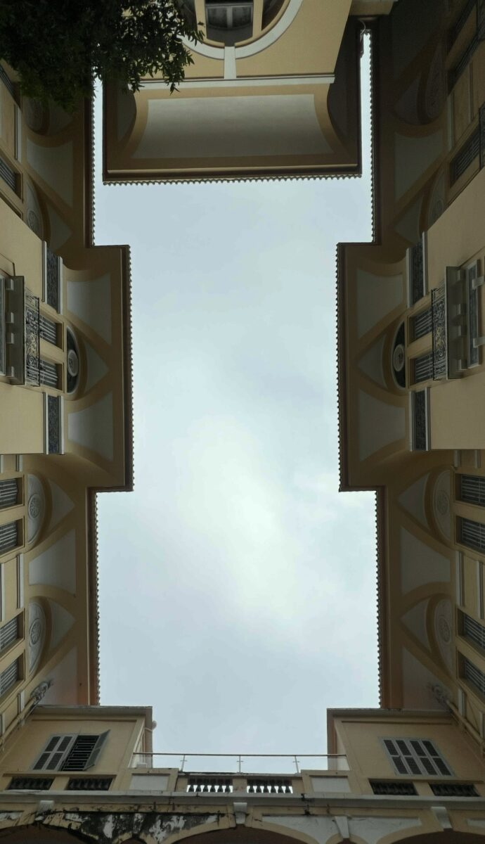 Ảnh 1-2: Được chụp tại BẢO TÀNG MỸ THUẬT TP.HCM vào buổi chiều nhiều mây. Những tòa nhà lớn với kiến trúc song song và đặt trưng.
