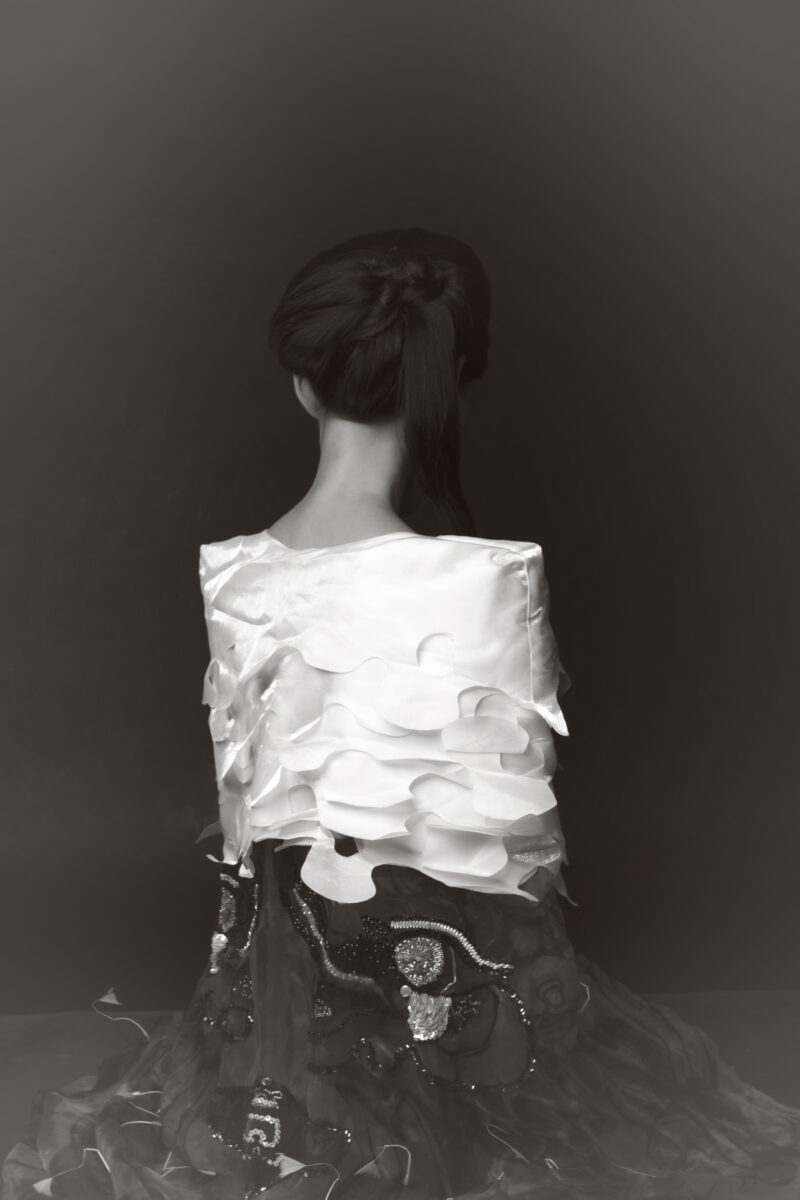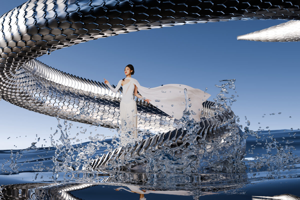 Khác với 4 bức ảnh trước, bức ảnh cuối được thực hiện mô phỏng phong cách 3D CGI Photography – để khẳng định rằng xu hướng thị giác hiện đại có thể trở thành phương tiện làm sống dậy và lan tỏa giá trị của di sản truyền thống. Sau hành trình dài, Tấm trở lại trong nhân dáng ban đầu, rực rỡ và mạnh mẽ hơn trong chiếc váy trắng tung bay – biểu trưng cho sự tự do và hy vọng. Bức ảnh được phóng tác từ bố cục tranh kính Nam Bộ “Quan Âm Nam Hải” , với thân rồng được phủ kim loại để tạo hơi thở futuristic. Hình ảnh Tấm đứng trên mặt nước cùng rồng lượn không nhằm khắc họa Quan Âm, mà mượn tinh thần biểu tượng của tranh để gợi khát vọng hạnh phúc và sự tái sinh trọn vẹn.