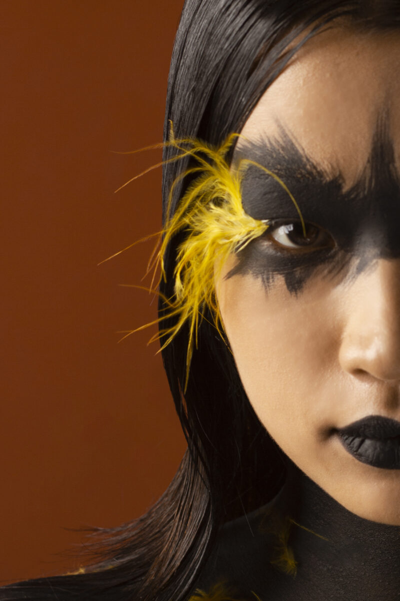Bước tái sinh đầu tiên – Vàng anh – lấy cảm hứng từ tranh Kim Hoàng, dòng tranh nổi bật với nền đỏ đặc trưng và các hình tượng chim muông như gà trống, chim công… Trong bức ảnh, gương mặt người mẫu được biến hóa thành chim vàng anh với hai sắc đen – vàng qua hình thức face-art/body-paint, như một sự tiếp nối tinh thần tạo hình giàu biểu tượng của dòng tranh này.