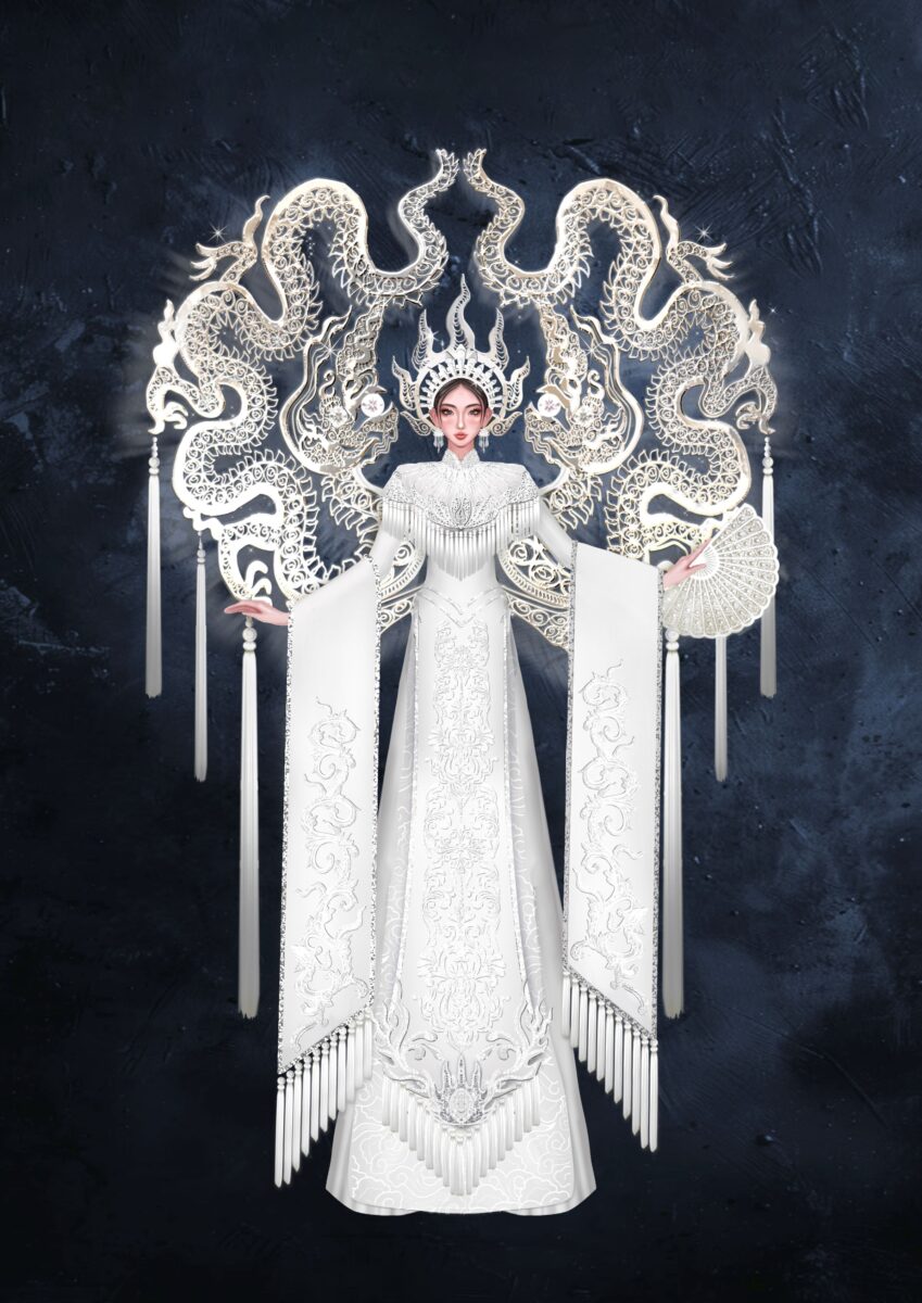 Bộ trang phục lấy cảm hứng từ làng nghề đậu bạc Định Công. Thiết kế kết hợp những đường nét tinh xảo của nghệ thuật chế tác bạc thủ công với hình ảnh lưỡng long chầu nhật biểu tượng của quyền lực, sự cao quý, linh thiêng và sức mạnh. Với tone màu trắng chủ đạo mang đến một tổng thể vừa sang trọng, hiện đại và thanh lịch. Trang phục không chỉ tôn vinh bàn tay tài hoa của người nghệ nhân Định Công mà còn mang trong mình thông điệp gìn giữ, phát huy giá trị văn hóa truyền thống của Việt Nam.
