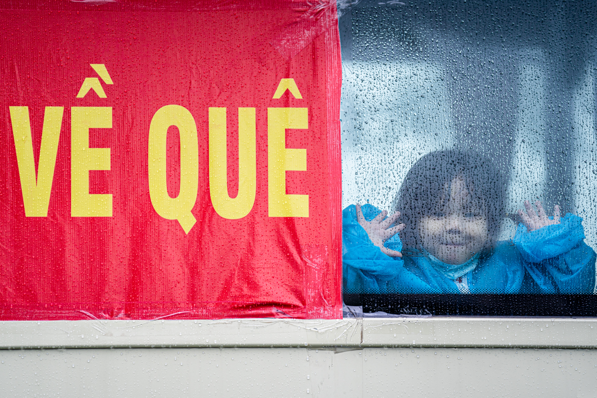 Hình ảnh cô bé vui mừng sau khi được lên xe về Quảng Nam cùng mẹ, trong buổi sáng ngày 22/7 tại Trung tâm Văn hóa quận Tân Bình (TP.HCM) để tránh dịch Covid-19 đang diễn biến phức tạp.
