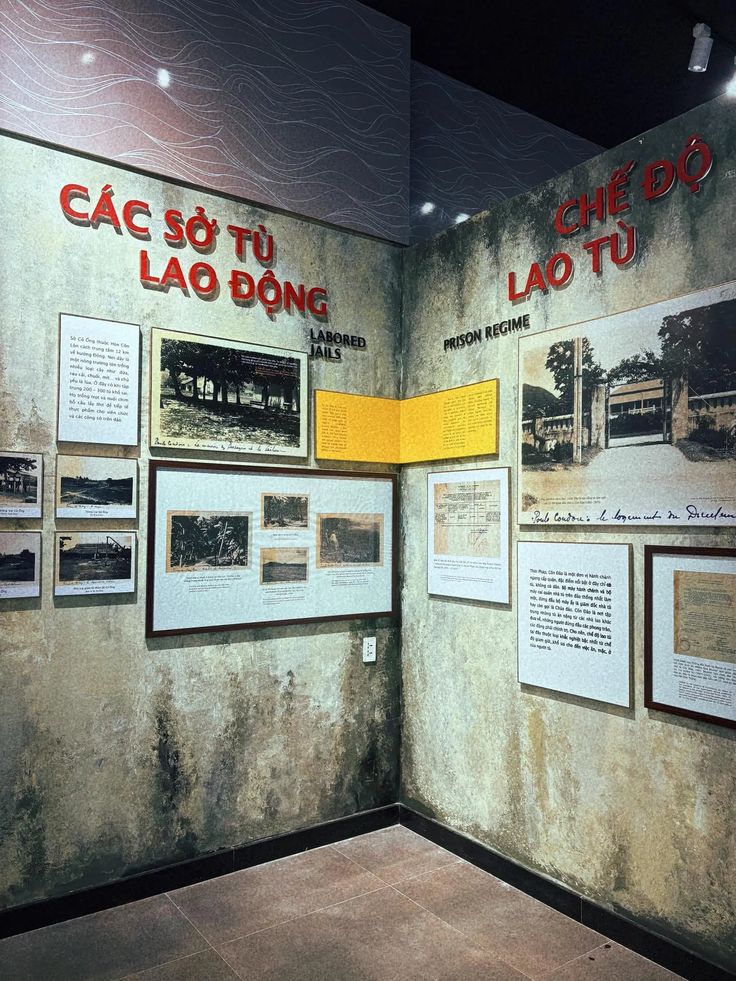 Ảnh 3: Khu trưng bày trong bảo tàng với các bảng thông tin, ảnh tư liệu về “Các sở tù lao động” và “Chế độ lao tù”, tái hiện hoàn cảnh lao động khắc nghiệt trong nhà tù thời xưa.