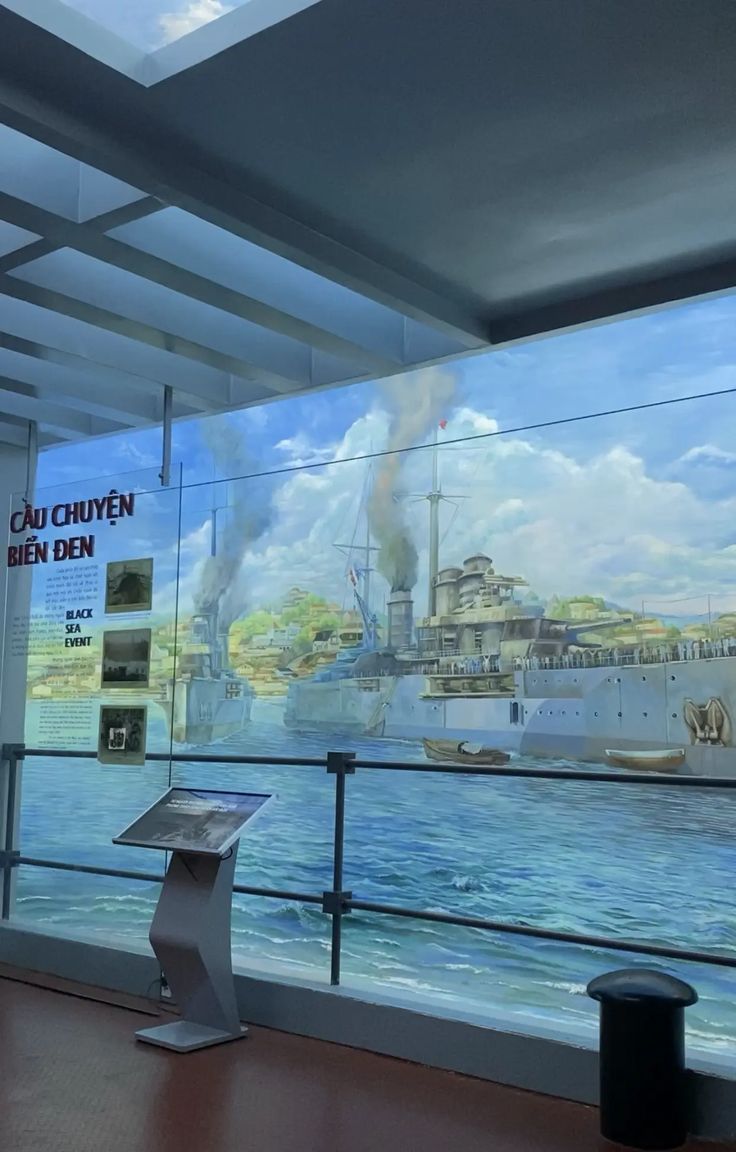 Ảnh 2: Một bức tranh lớn mô tả cảnh tàu chiến trên biển, khói bay lên từ ống khói, kèm bảng thông tin với tiêu đề “Câu chuyện Biển Đen” trong không gian triển lãm.