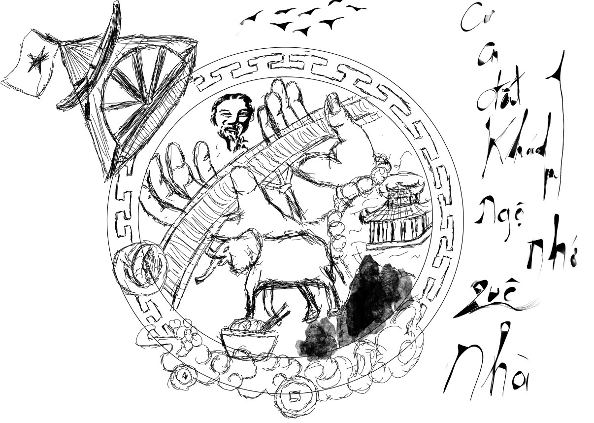 Một vòng tròn bao gồm 2 đặc sản Việt Nam đó là món trứng vịt lộn cùng với phở. Không những thế mà còn có một địa điểm du lịch nổi tiếng đó chính là cầu vàng ở Đà Nẵng và đã được vào trong 100 địa điểm du lịch đẹp nhất vào năm 2018. Còn có trang phục nón lá kèm với cây quạt và chiếc thuyền bè của người dân vùng biển. Không thể bỏ sót người anh hùng của dân tộc và được người dân Việt Nam gọi với một cái tên thân thuộc đó chính là Bác Hồ, Bác chính là người cha đã đi tìm con đường cứu nước cho người dân Việt Nam và giải phóng dân tộc để cho chúng ta có một cuộc sống ấm no như bây giờ. Bên cạnh bức tranh có một câu là: ”Cư an đất khách ngộ nhớ quê nhà” muốn nói là đi đâu cũng phải nhớ về quê hương của mình mà không được quên nơi mà mình sinh ra và lớn lên. Bức tranh được vẽ bằng tay nguệch ngoạc chưa hoàn thiện hẳn cũng như chính con người của chúng ta… Vẫn chưa thể hoàn thiện tốt về mọi mặt cho dù có cố gắng làm tốt đi chăng nữa…