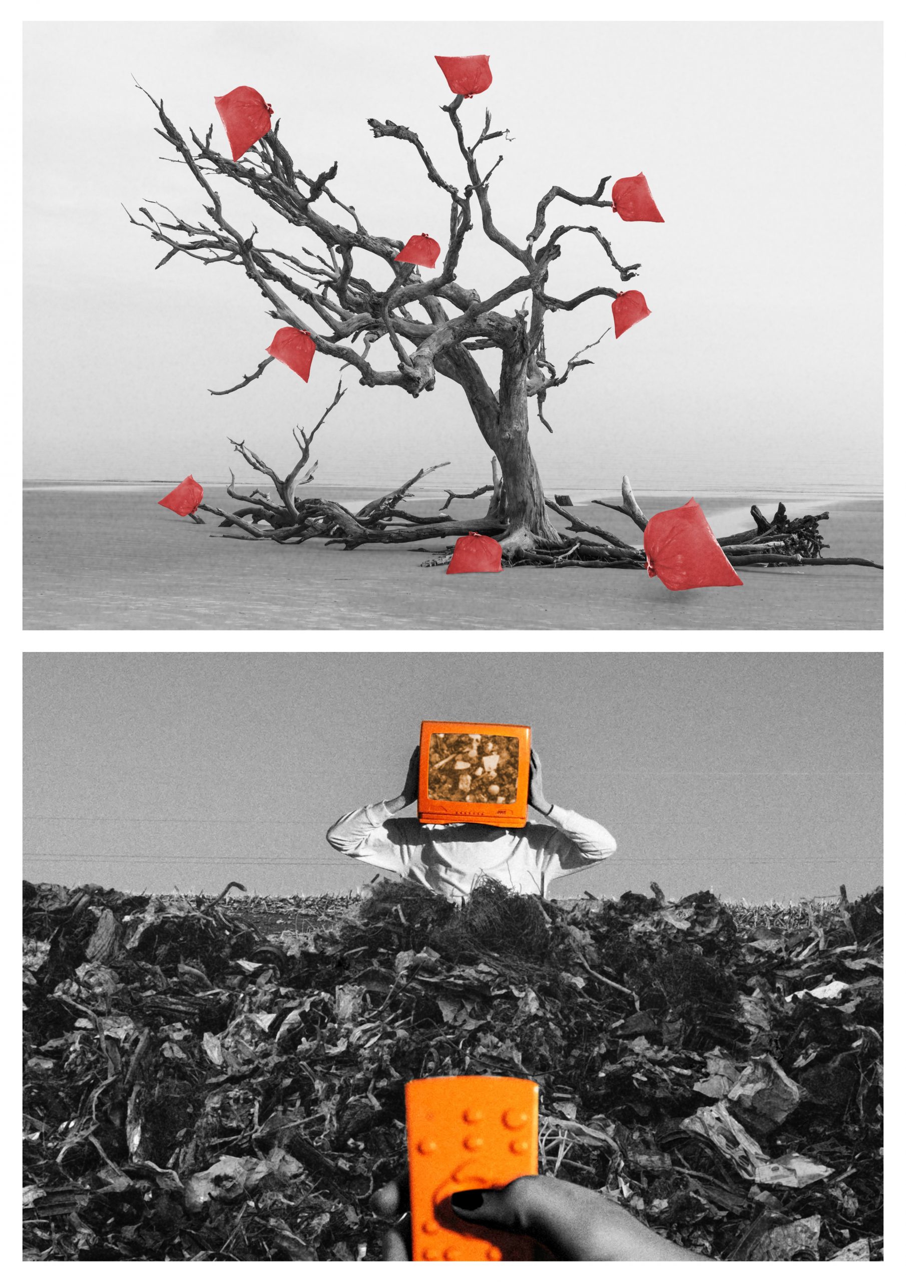 Với màu đỏ đại diện cho sự khao khát, màu đỏ tạo cảm giác thèm ăn và đói. Nhưng trong bức ảnh thì cái cây khô héo lại mọc ra những trái chất liệu nilon đỏ rực khiến cho con người từ cảm giác thèm dần mất hứng thú, từ đó giúp con người suy nghĩ về môi trường.
