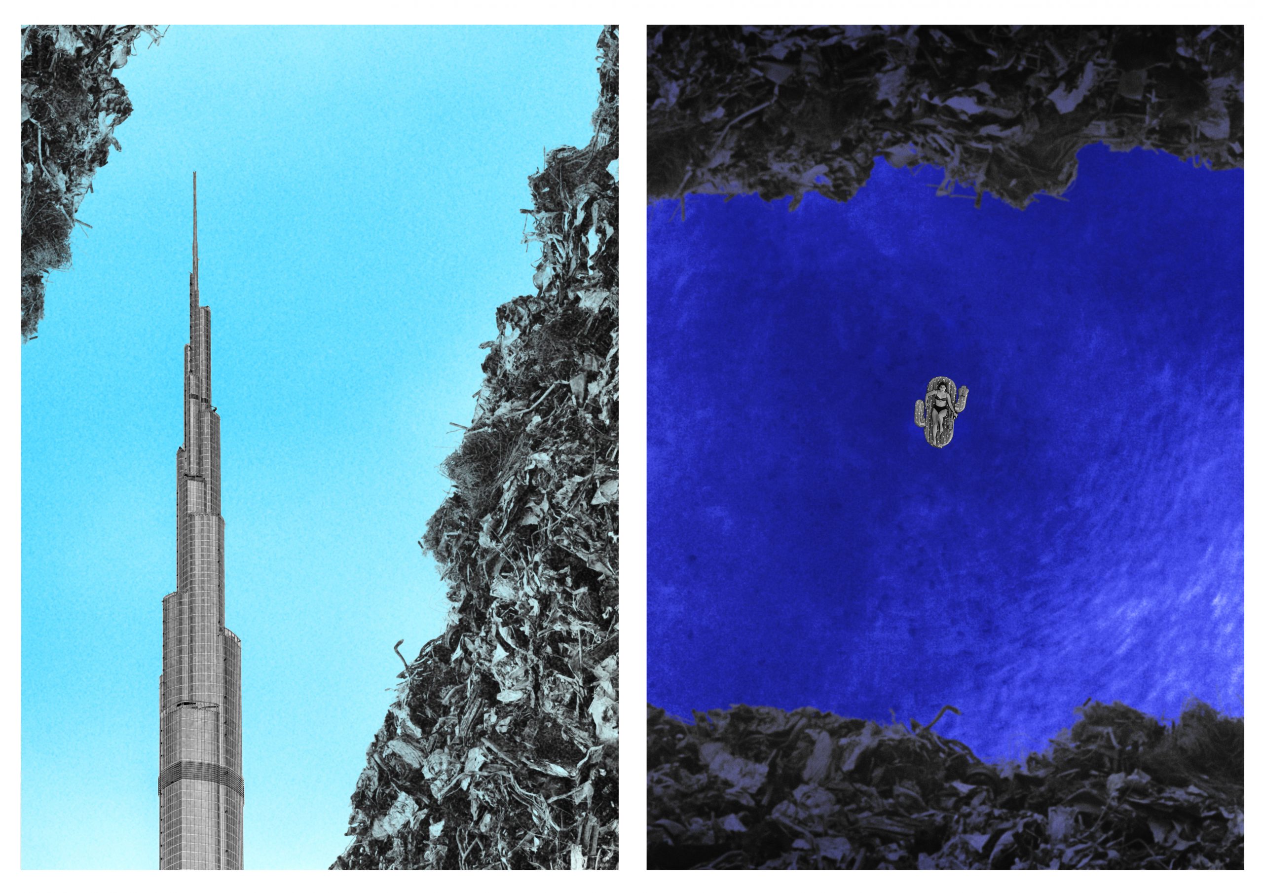 Với màu lục là màu hy vọng, màu của bầu trời. Con người luôn tranh nhau xây dựng những tòa nhà cao nhất như muốn chạm vào bầu trời, và trong hình là tòa nhà Burj Khalifa cao nhất thế giới nhưng vẫn phải nhường chỗ cho những đống rác cao hơn.