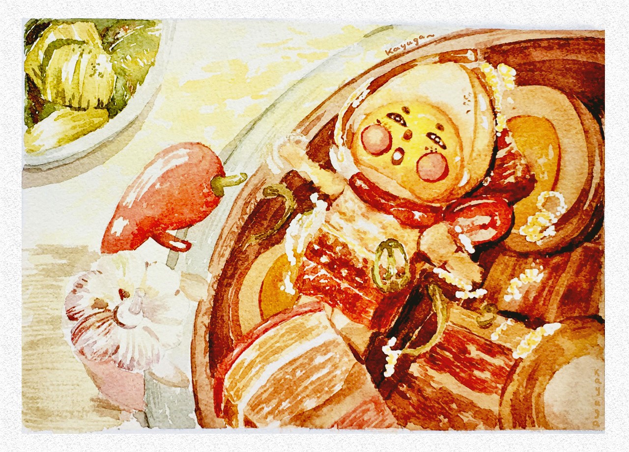 VIỆT NAM, “HƯƠNG, VỊ, SẮC” Ngày Tết Nguyên Đán ở VN là ngày sum họp, gia đình mình thường tề tựu về quê để vui Tết cùng nhau, việc chế biến các món ăn ngày Tết theo đó cũng trở nên đặc biệt đến lạ. Trong các món ăn trên mâm cơm ngày Tết thì thịt kho trứng (hay còn gọi là thịt kho tàu, thịt kho nước dừa) luôn là một món ăn quan trọng không thể thiếu – một món ăn tùy theo vùng miền mà được biến tấu theo nhiều cách khác nhau. Người miền Tây chúng mình thường kh o cùng nước dừa để tạo vị thanh ngọt đặc trưng. Mọi người trong nhà mình thường chia công việc ra làm, các chú ra sau vườn hái dừa, các dì các mẹ dậy sớm để mua được những miếng ba rọi tươi ngon nhất, bọn trẻ con thì đam mê với trò bóc vỏ trứng vịt, riêng mình được giao công việc nghiền tỏi ớt. Thịt kho trứng thường được nấu lâu trên bếp cho trứng ngấm đẫm đậm đà, cho miếng ba rọi mềm ngon đượm vị và được hâm đi hâm lại vào mỗi bữa ăn, chính vì vậy mà món ăn này đối với mình là một sự kết hợp hài hòa của hương, vị, sắc. Thịt kho trứng khi nấu xong đã có những sắc màu hấp dẫn đến mê người, màu đỏ đẹp mắt của ớt, màu nâu óng ánh của thịt và màu vàng ươm của trứng đánh thức mọi giác quan của mình. Chào đón khứu giác mình đầu tiên là vị cay thơm nồng nàn của tỏi ớt, tiếp đến là vị ngọt thanh của nước dừa, cắn vào một miếng vị thịt hài hòa, vị béo của mỡ và vị bùi của trứng, ăn kèm với cải muối chua chua khiến mình không thể ngừng đũa. Nồi thịt kho trứng sóng sánh bên chén cơm nóng bốc hơi nghi ngút luôn là niềm khắc khoải đối với người con xa quê như mình, là nỗi nhớ mong những ngày Tết đầm ấm vui vầy luôn đong đầy trong ký ức. Bức tranh “Thịt kho hột vịt” của mình thể hiện niềm đam mê với món ăn đậm đà hương vị ấy. Mình vẽ một bé trứng đang trầm mình trong nồi thịt nâu sánh lấp lánh mỡ với tỏi, ớt và dĩa dưa chua cạnh bên.
