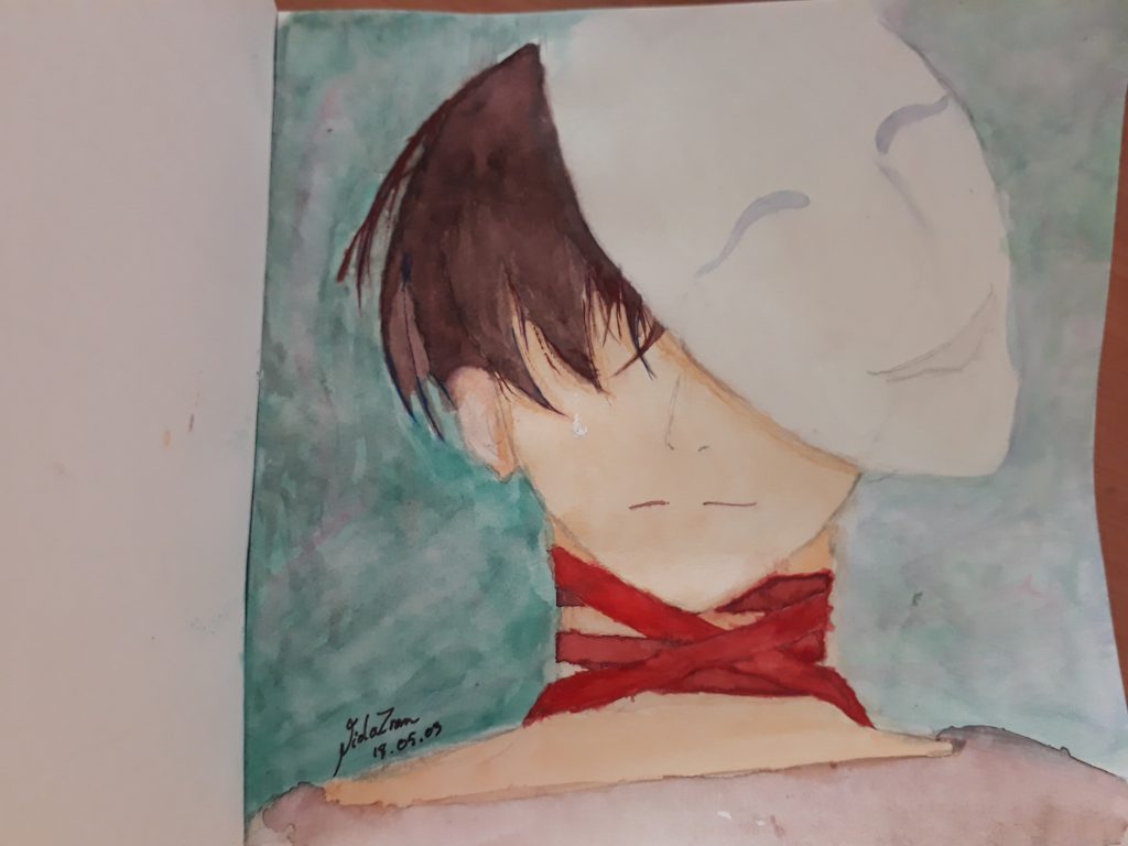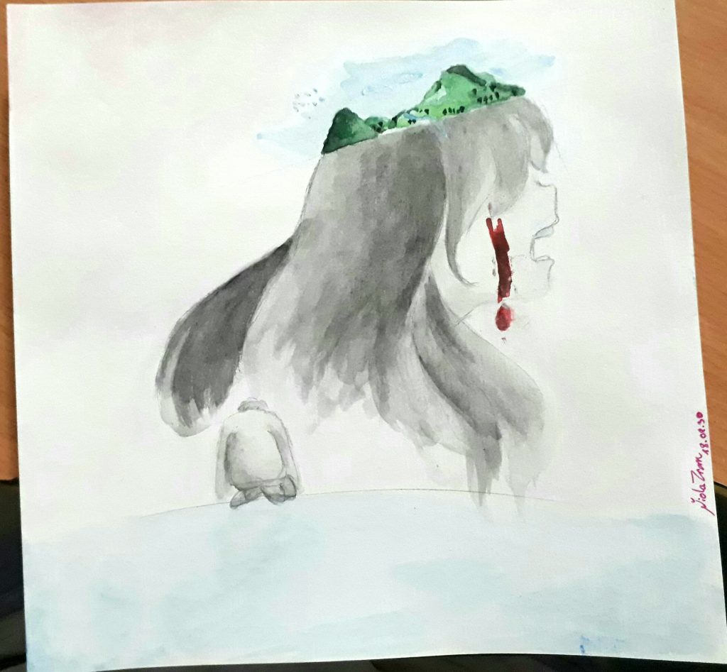 Đây là bức tranh đầu tiên mình thử sức với kỹ thuật tô màu nước, và hoàn thành nó sau 4 tiếng. Lúc vẽ ra nó là lúc tâm trạng bị bất ổn, mình khóc suốt và có những suy nghĩ tiêu cực về gia đình. Nghĩ dến định kiến xã hội giữa nam và nữ, đột nhiên cảm thấy bản thân thật thừa thải và vô dụng. Dồn nén ngày qua ngày những suy nghĩ đó khiến mình quyết định vẽ bức này.