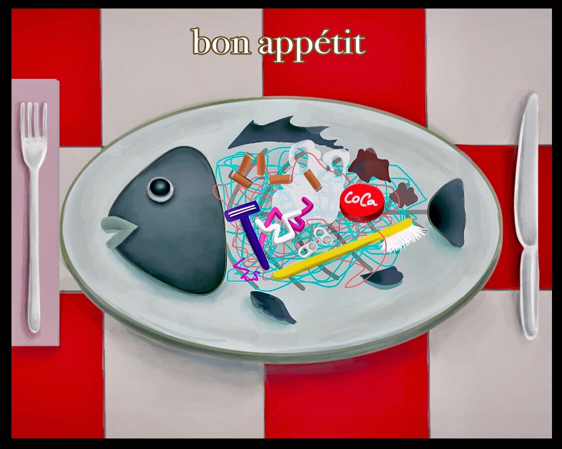 “Bon appétit” là bức tranh mình vẽ về một tương lai viễn tưởng khi mà con người vẫn cứ vô tư phá hoại môi trường bằng những hành động vô ý thức như vứt rác bừa bãi, cụ thể là vứt những vật chất vô cơ vào môi trường biển đáng trân trọng. Và rồi một vòng tuần hoàn lại trả mọi thứ về cho con người theo đúng thứ tự: con người vứt rác -> sinh vật tiêu thụ rác -> con người mang rác trở về bằng cách tiêu thụ sinh vật.