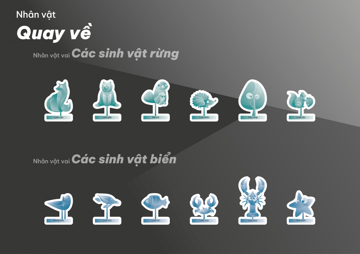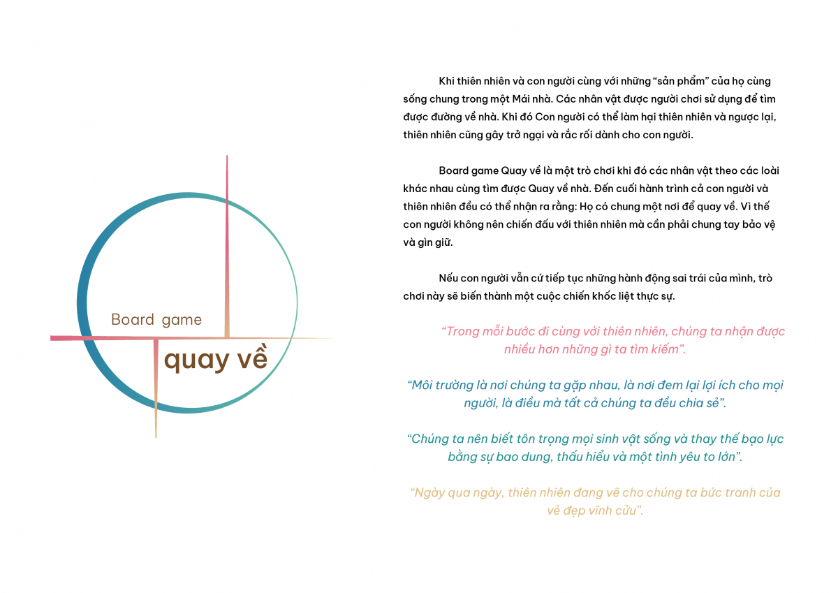 Board game Quay về là một trò chơi mà trong đó các nhân vật theo các loài khác nhau cùng tìm được quay về nhà. Đến cuối hành trình, cả con người và thiên nhiên đều có thể nhận ra rằng: Họ có chung một nơi để quay về. Vì thế con người không nên chiến đấu với thiên nhiên mà cần phải chung tay bảo vệ và gìn giữ.