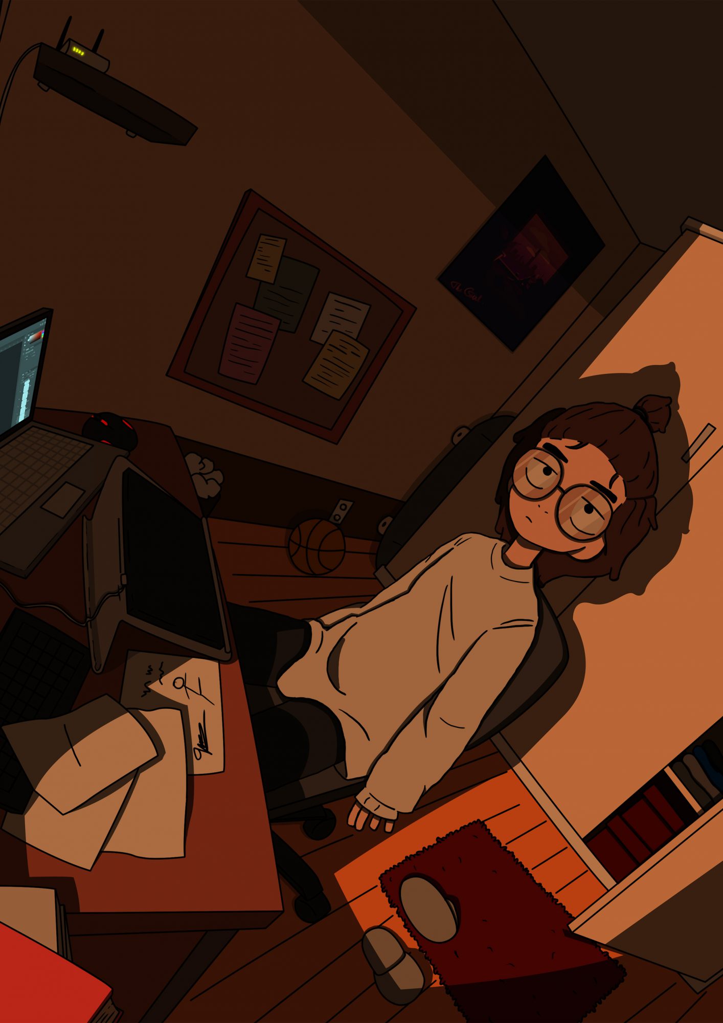 Một tác phẩm thực tế được lấy cảm hứng từ chính cuộc sống thường nhật trong chuỗi ngày giãn cách xã hội,. Thời gian này thực sự quý báu để ta suy nghĩ về mọi thứ, rèn luyện sức khỏe, nâng cao những kỹ năng. Trong bức vẽ là một anh chàng tận dụng khoảng thời gian này để suy nghĩ cho những ý tưởng của mình, tạo ra nhiều tác phẩm khác mang những ý nghĩa tích cực đến cho cộng đồng. Ở nhà nhưng không về “Ở không”, vậy nên hãy chấp hành những quy định để cùng đẩy lùi đại dịch.