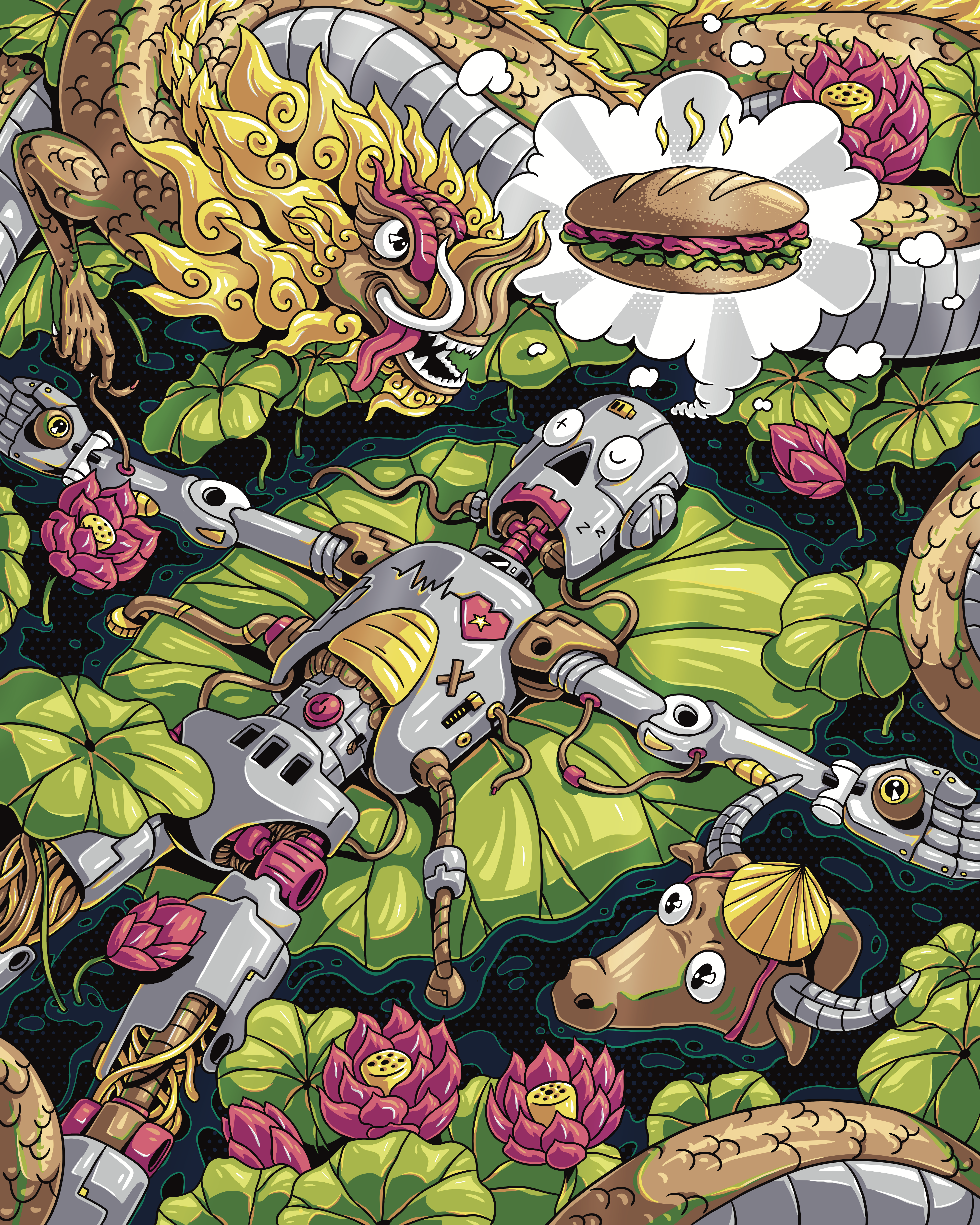 Trong tác phẩm mình đã vẽ một con robot đang nằm thư giãn ở trên một đầm sen, con robot là đại diện con người cho thời địa 4.0 bao quanh là Hương – Vị – Sắc truyền thống của Việt Nam. Sau hàng giờ làm việc cùng đống máy móc không còn sức lực, ý nghĩ duy nhất trong đầu nó là một chiếc bánh mì, món ăn truyền thống quen thuộc của chúng ta, xung quanh bao phủ bởi hương thơm thoang thoảng của những bông sen, bên cạnh đó là hình ảnh rồng thời Lý, con trâu, nón lá đều làm nổi bật thêm bản sắc của người Việt.