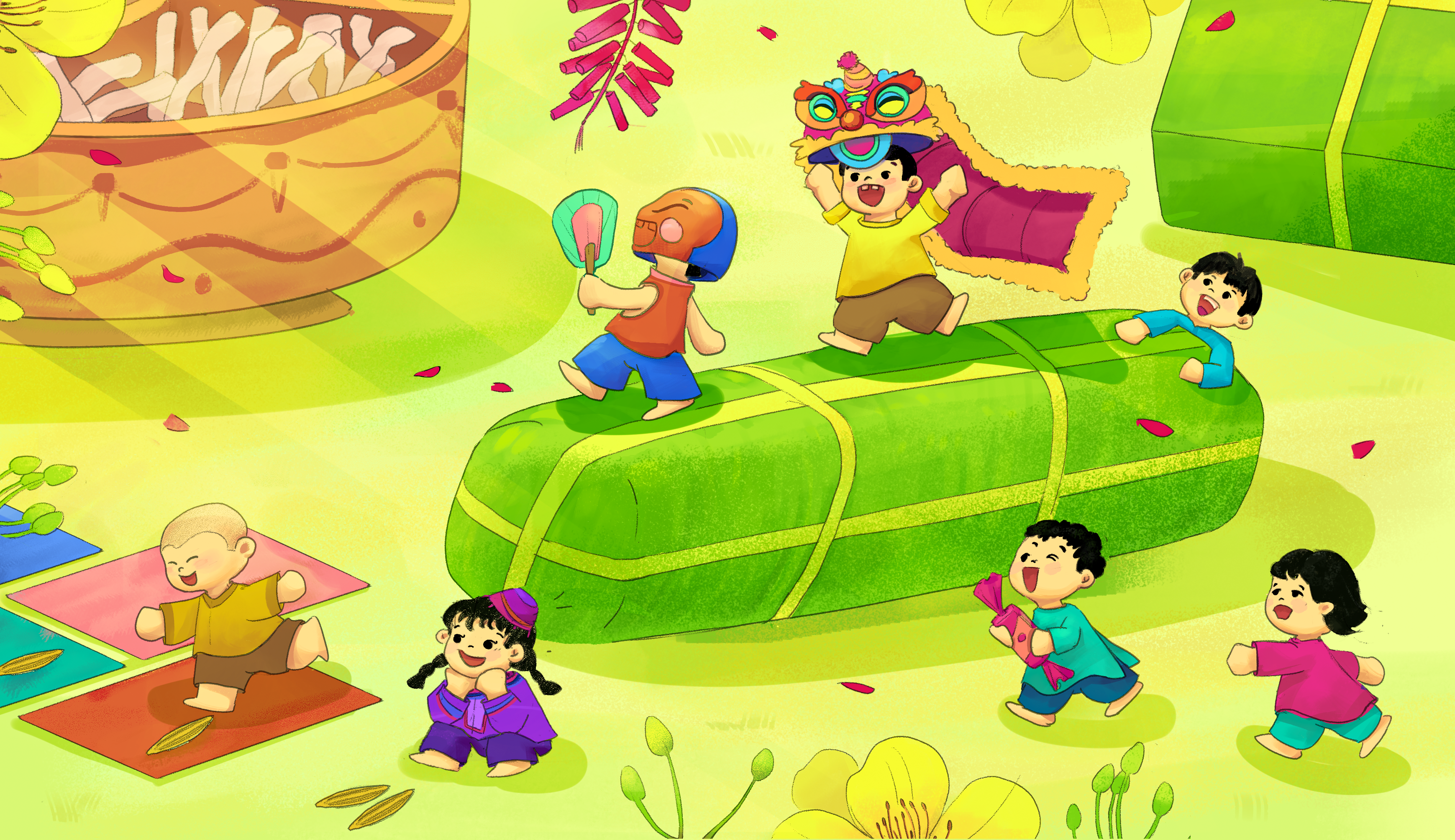 Trong quá trình lên ý tưởng cho cuộc thi, mình đã rất vất vả để kết nối với chính bản thân, nhằm mục đích tìm ra thứ mang đậm tinh thần Việt Nam nhất trong mình. “Trẻ con chơi” là một tác phẩm mà mình lấy cảm hứng từ tập sách “Trẻ con hát, trẻ con chơi”. Tác phẩm thể hiện hình ảnh các em nhỏ vui chơi, đùa giỡn với nhau. Xung quanh là những món ăn, trò chơi ngày Tết, nhằm gợi không khí vui tươi, hồn nhiên, đề cao nét đẹp văn hóa dân gian.