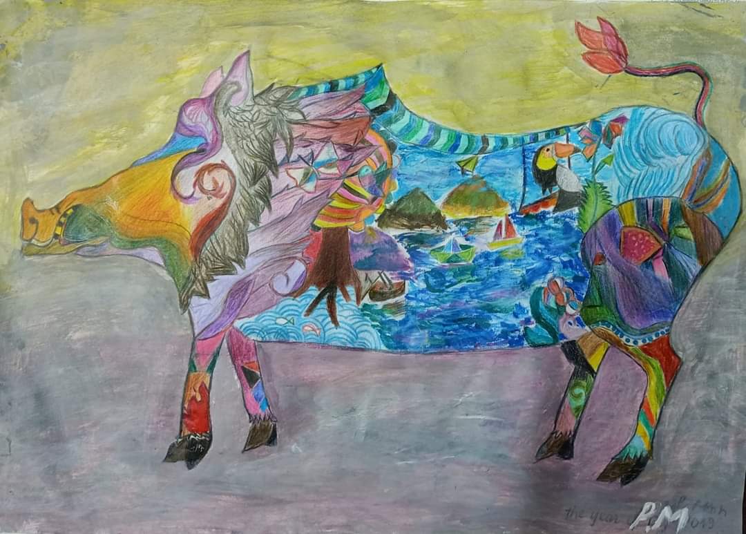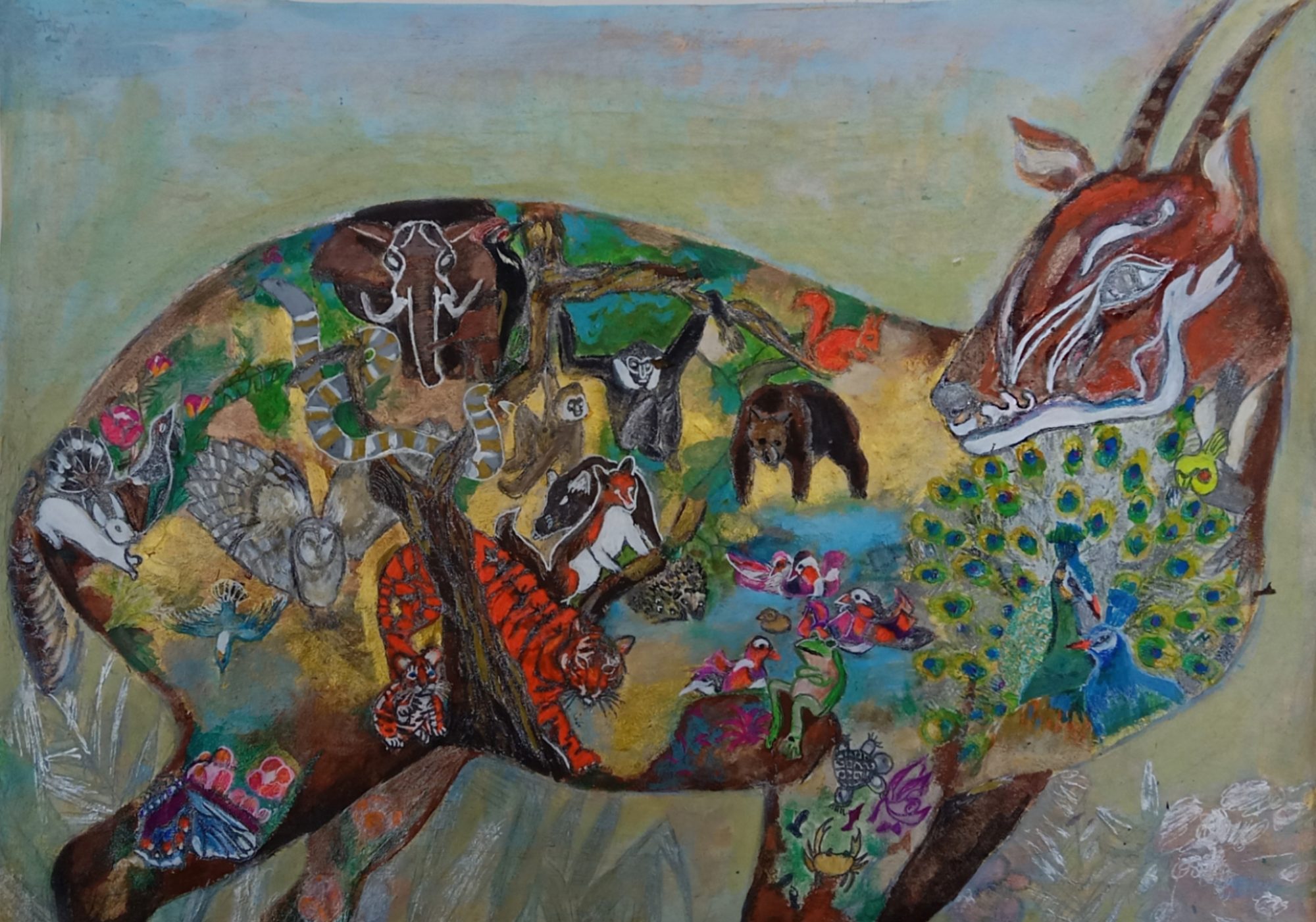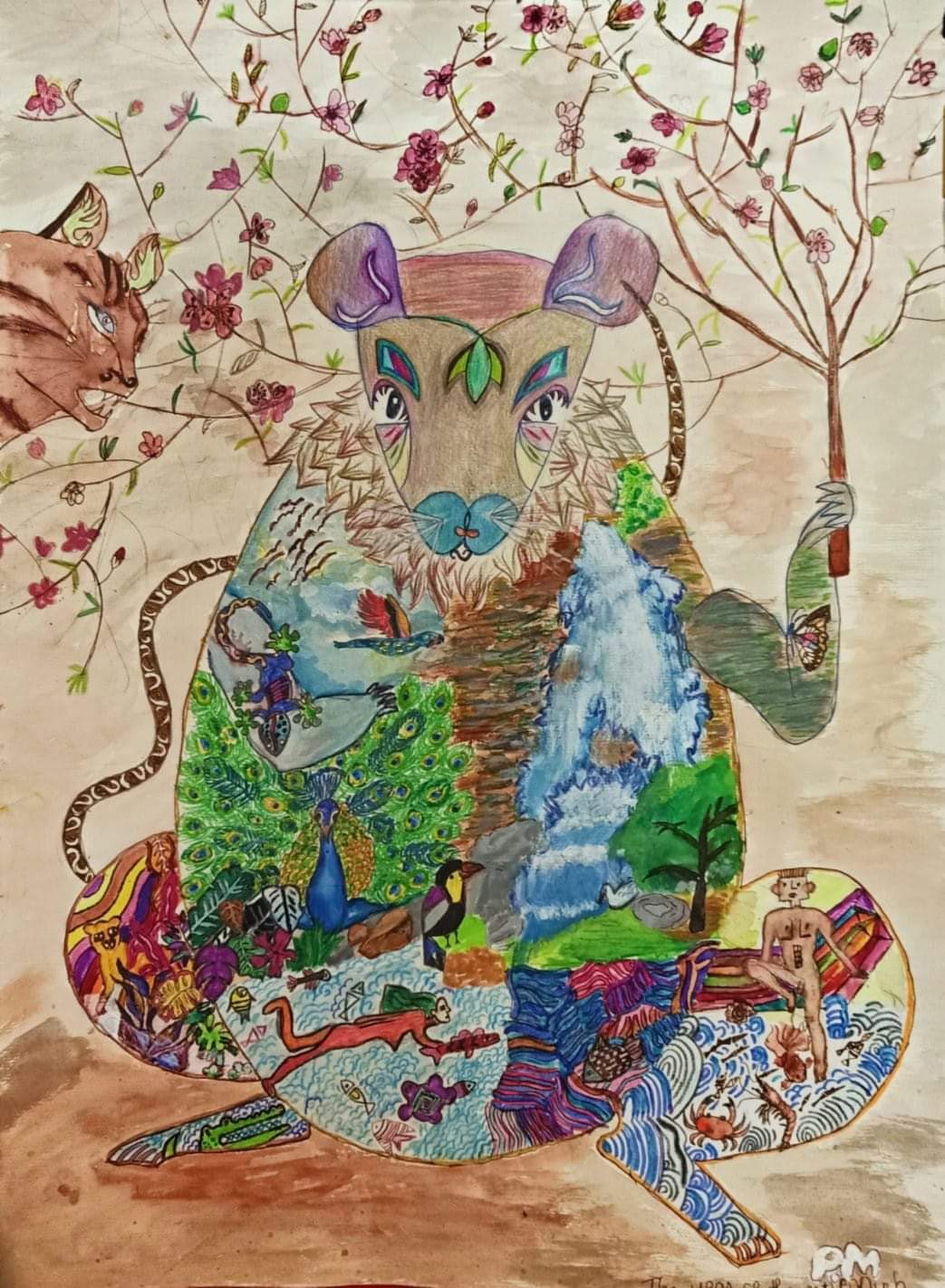 Tinh thần xanh của em đó là sống chan hoà với thiên nhiên. Bức tranh với hai loài vật trên bờ vực tuyệt chủng tại Việt Nam: Sao la và Khỉ mũi hếch, được em vẽ trong mơ và cũng là thực tế em trải nghiệm.