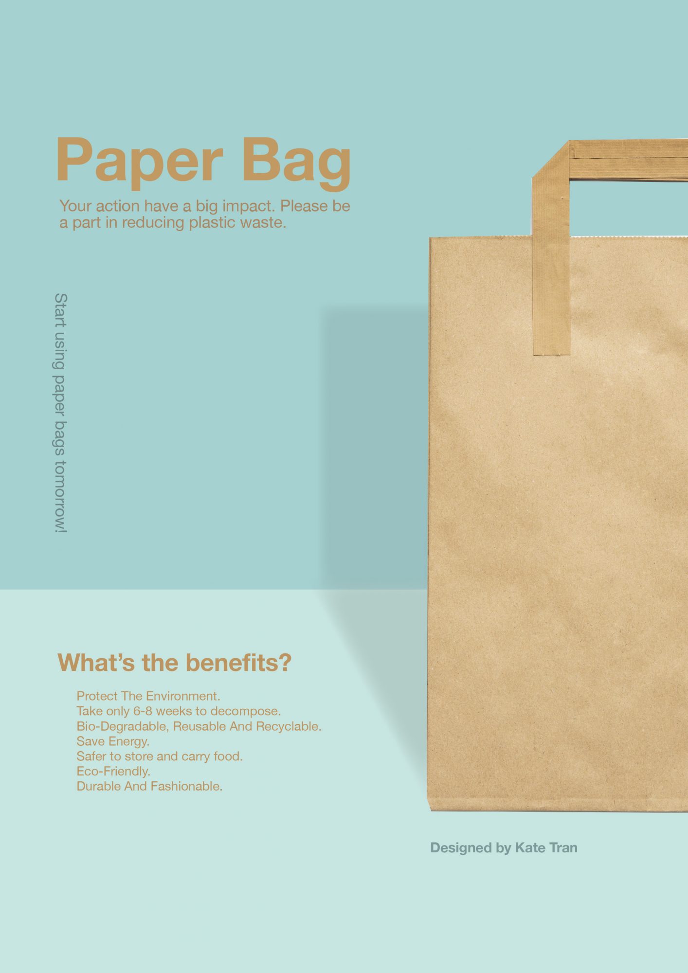 Hẳn túi nilon đã trở thành một thứ quá quen thuộc và cần thiết đối với nhiều người. Tuy vậy, tác hại của túi nilon gây ra đối với môi trường là vô cùng to lớn, khi mà các chất độc hại từ túi nilon có thể gây ô nhiễm đất, ô nhiễm môi trường biển. Vậy, làm thế nào để thay thế túi nilon trong cuộc sống hằng ngày? Hãy sử dụng túi giấy. Túi giấy chỉ mất từ sáu đến tám tuần để phân hủy, lại có thể được tái sử dụng, tái chế cho các mục đích khác nhau. Không những thế, túi giấy còn an toàn khi đựng thức ăn, mà chúng ta không cần phải lo đến các chất độc hại thấm vào thức ăn trong quá trình vận chuyển. Còn chần chờ gì mà không chuyển qua sử dụng túi giấy ngay thôi các bạn ơi.