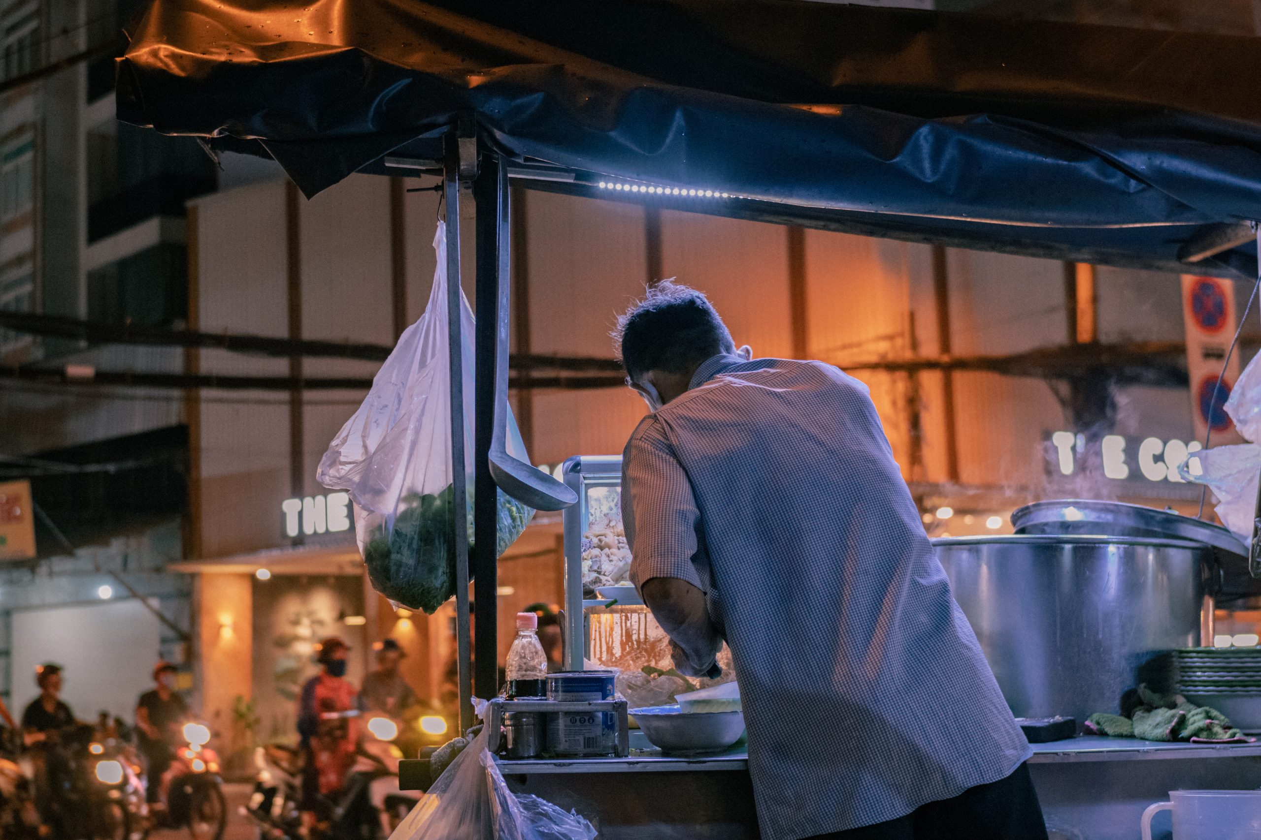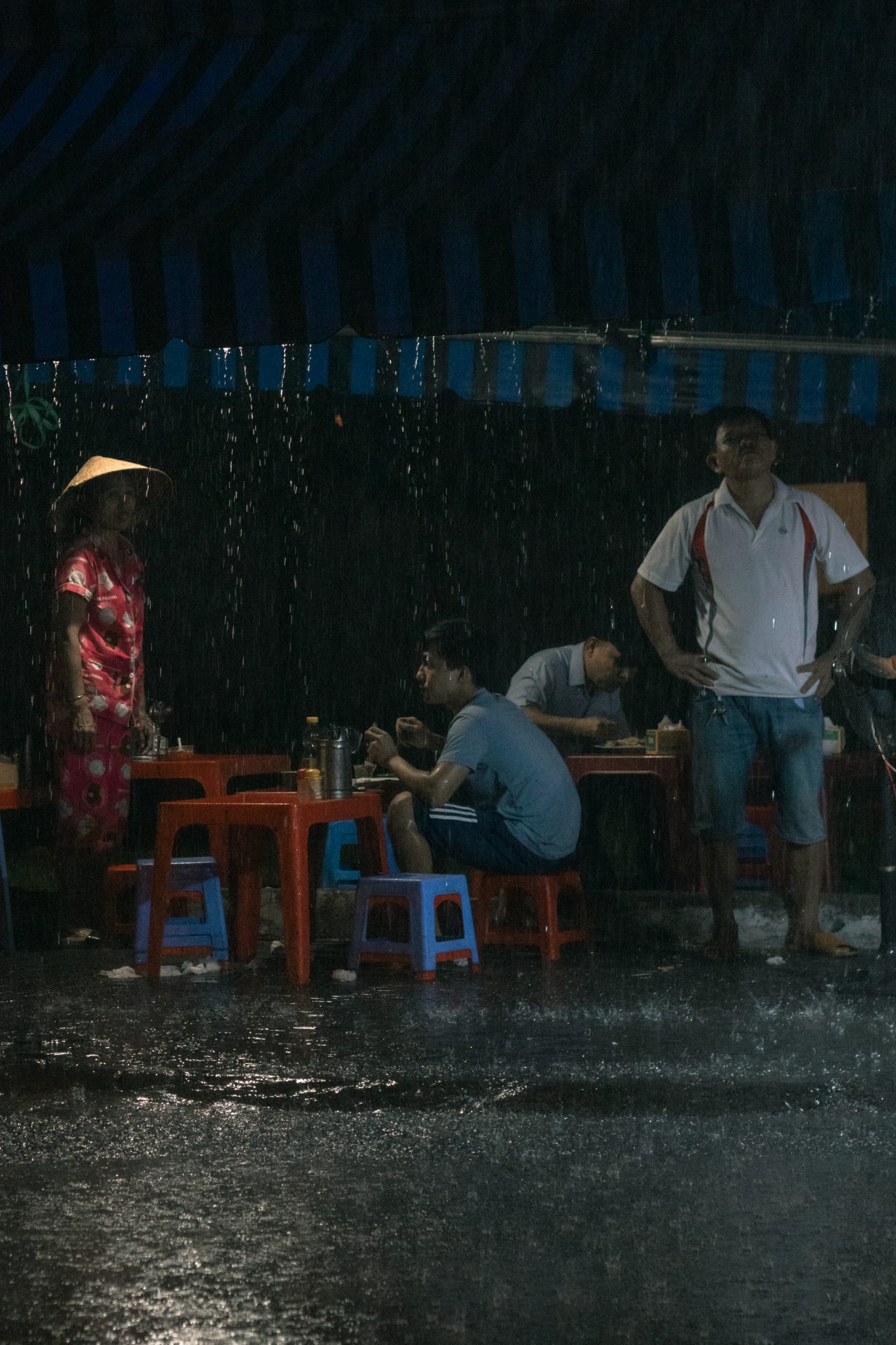 Bức ảnh mình chụp khi đặt chân đến Sài Gòn chưa được bao lâu. Gam màu ấy quá đỗi thân thuộc, ánh trắng xanh từ những xe hủ tiếu thường thấy kết hợp với màu vàng của đèn đường. Những ánh sáng yếu ớt nhưng đẹp đẽ. Dòng người tấp nập , vội vã, xe hủ tiếu nằm im mà cũng vội – vội vàng làm những tô hủ tiếu thơm nức mũi đem ra cho những con người bụng còn kêu rột rột. Khói từ nồi nước lèo bốc lên nóng hổi. Và rồi cơn mưa đổ xuống, lúc này mà ăn một tô hủ tiếu rõ ràng là ấm lòng người hơn biết bao nhiêu! Một ngày mưa vui bên tô hủ tiếu, hạnh phúc đơn giản là như vậy.