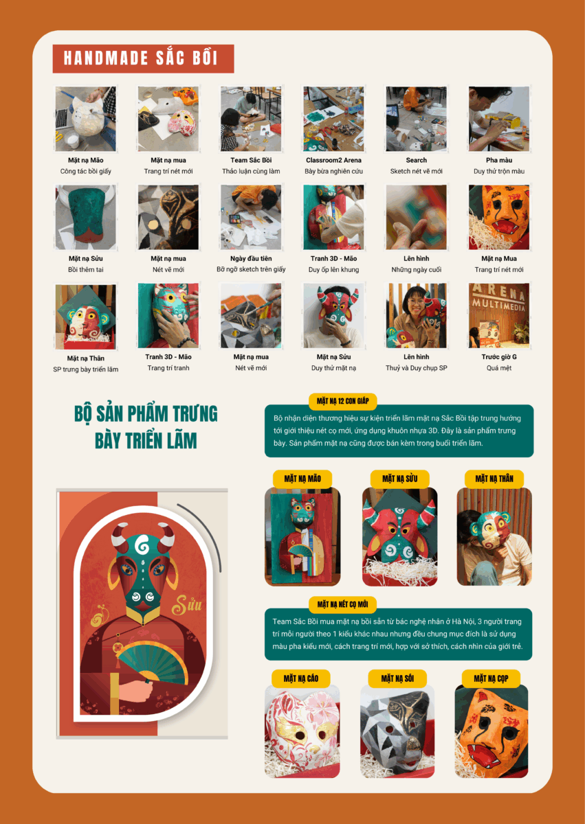 Em là học viên của Arena, được biết tới cuộc thi Show It NOW từ các năm trước nhưng chưa đủ tự tin để tham gia. Nay nhờ trung tâm đào tạo và nuôi dưỡng đam mê, em mong muốn bảo tồn văn hóa Việt Nam, đặc biệt là nghề bồi mặt nạ của các nghệ nhân Miền Bắc nên đã làm ra bộ nhận diện Triển Lãm Mặt Nạ Sắc Bồi để tham gia Show It NOW 2025. Đây không chỉ là một cơ hội, cũng là nhiệt huyết để đưa tới mọi người biết về Triển Lãm Mặt Nạ Sắc Bồi thông qua thiết kế đồ họa. Đây là cầu nối mạnh mẽ nhất giúp tái định hình giá trị văn hóa và thổi sức sống đương đại vào những giá trị vĩnh cửu. Em tin rằng, chính sự sáng tạo này sẽ là lời giải đáp thiết thực nhất cho chủ đề “Re-Imagine: Vì một Việt Nam đẹp hơn”.
