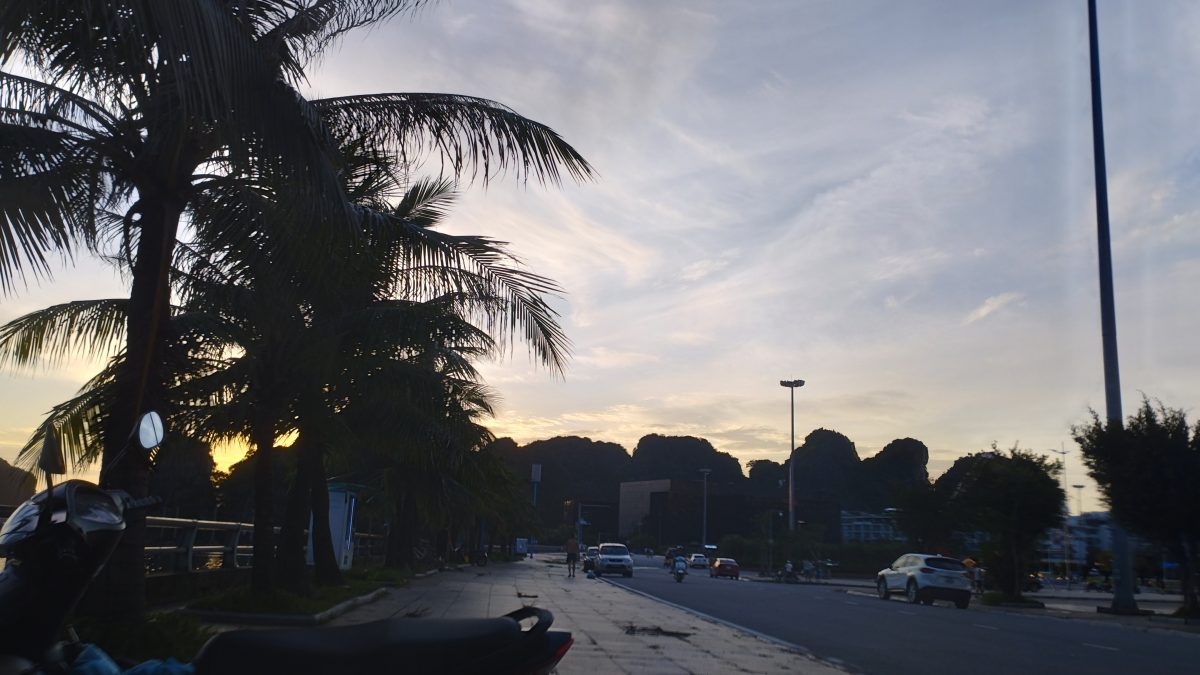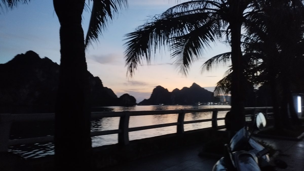 Tác phẩm dưới đây của mình là khung cảnh bình yên và mát mẻ bên ven vịnh, không khói ô nhiễm, không rác thải, không bụi bặm. Những tán cây cọ xào xạc đung đưa trong làn gió mát mang một chút vị mằn mặn của biển thổi vào. Mặt nước nhiễm một chút màu của bầu trời khi hoàng hôn buông xuống.