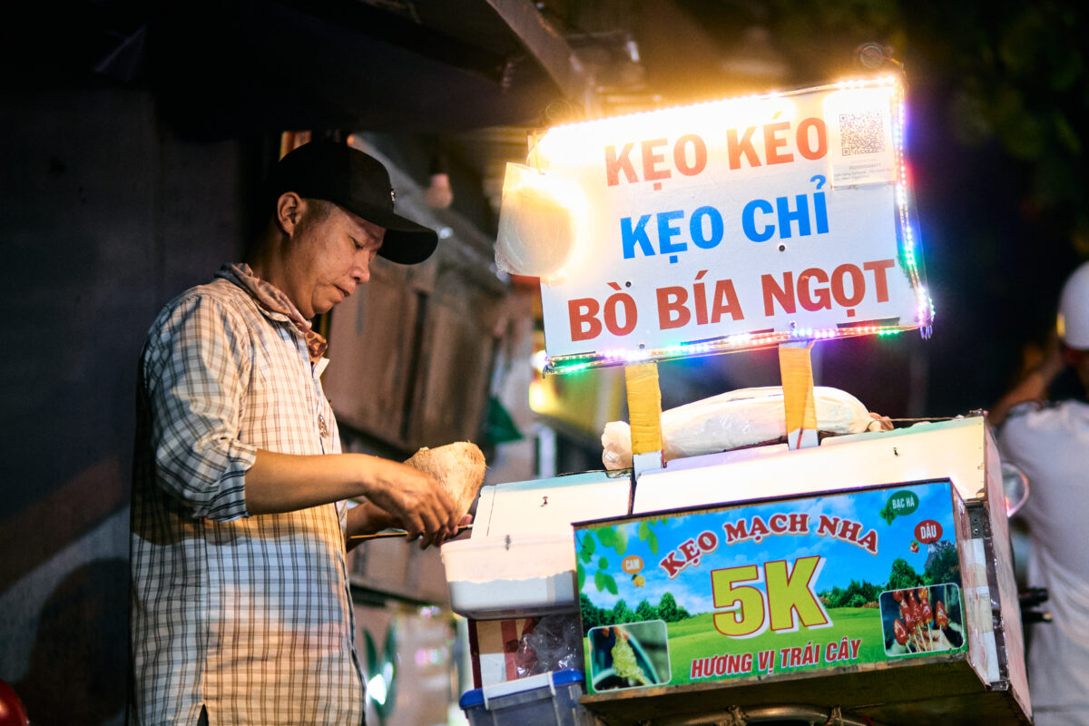 Tác phẩm 5: Ánh sáng lửa từ quầy kẹo kéo như linh hồn của ẩm thực đường phố, vẽ nên khuôn mặt người bán hàng trong sự tập trung.
