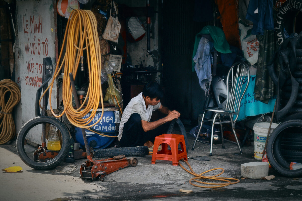 Tác phẩm 3: Góc phố nhuốm màu thời gian, nơi người thợ ngồi xổm chắt chiu từng phút giây để mưu sinh.