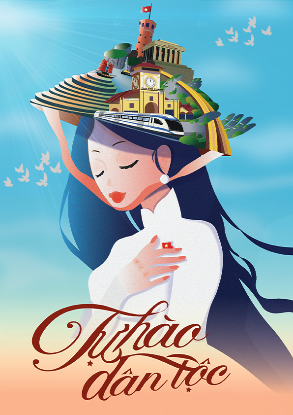 Trong tác phẩm “Tự hào dân tộc”, mình muốn kể về hình ảnh người con gái Việt Nam – mái tóc đen dài, tà áo dài trắng, giản dị và lịch sự. Với mình, đó là hình ảnh rất đặc trưng, vừa gần gũi vừa mang vẻ đẹp tinh thần của người Việt. Chiếc nón lá cô gái đội không chỉ là một vật quen thuộc, mà mình xem đó như hình hài của cả đất nước Việt Nam – nơi chứa đựng văn hoá, con người và niềm tự hào dân tộc. Dáng đứng của cô gái hướng về ánh sáng và cúi đầu xuống thể hiện sự kính trọng và tự hào về quê hương, về những giá trị bình dị mà bền vững của Việt Nam.