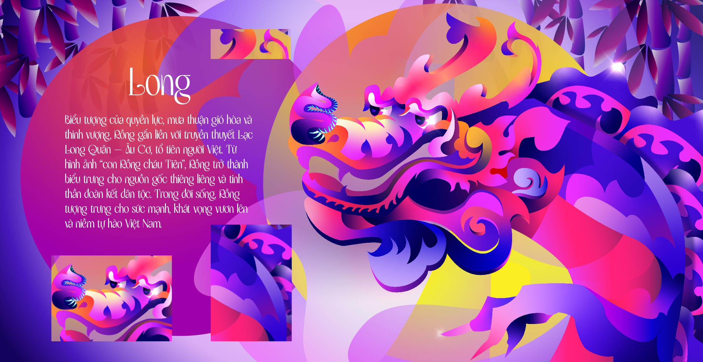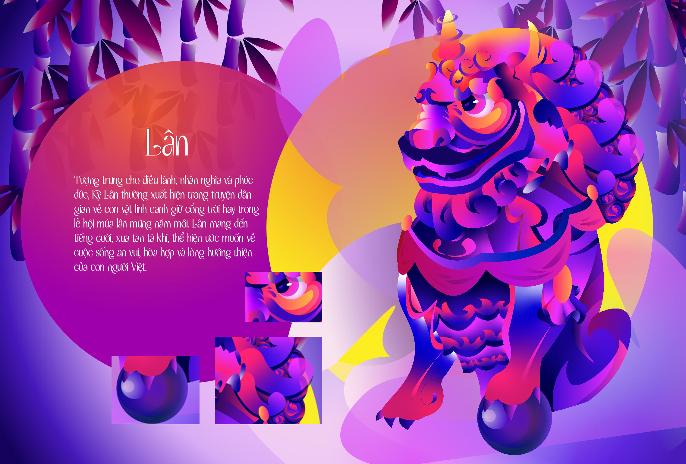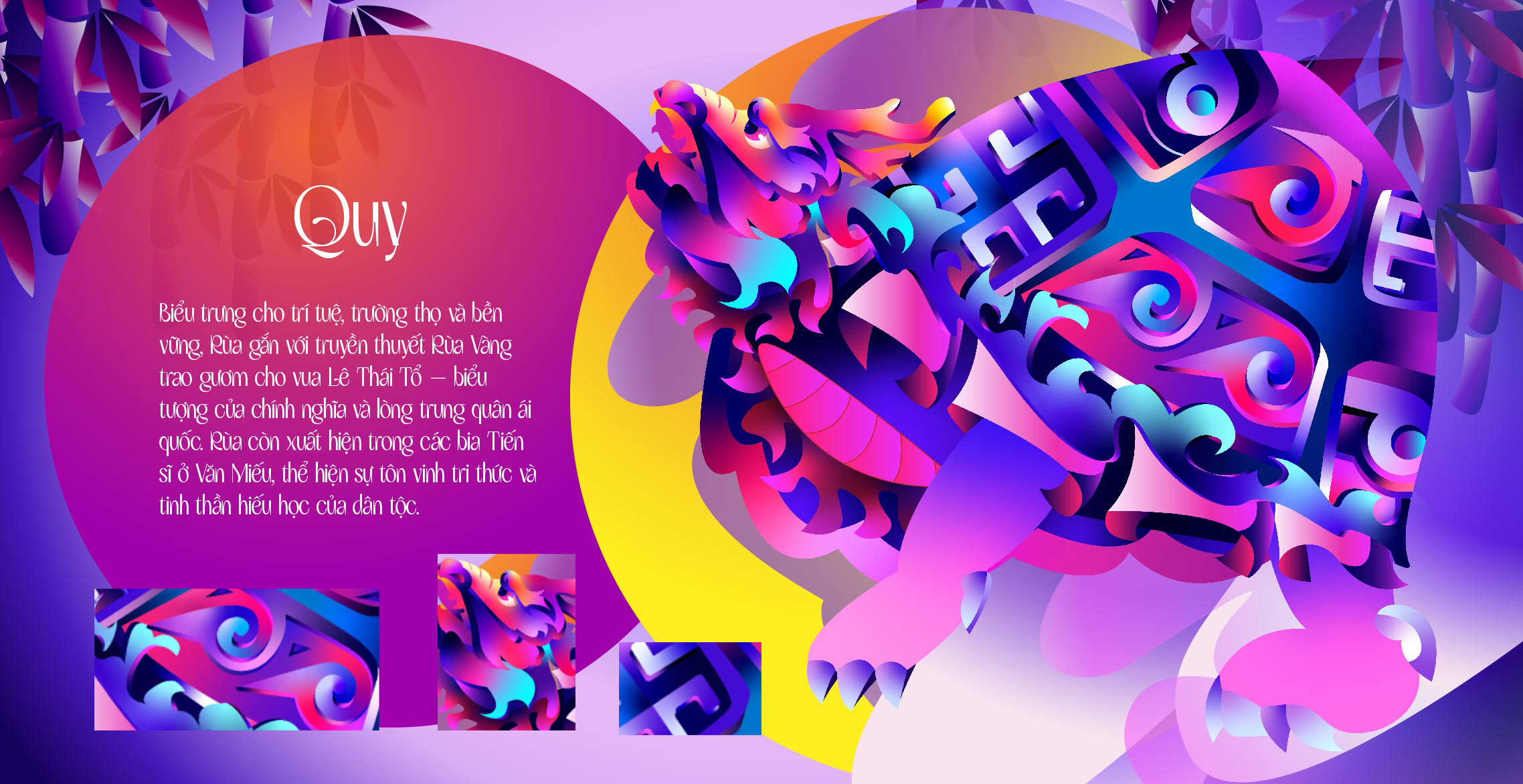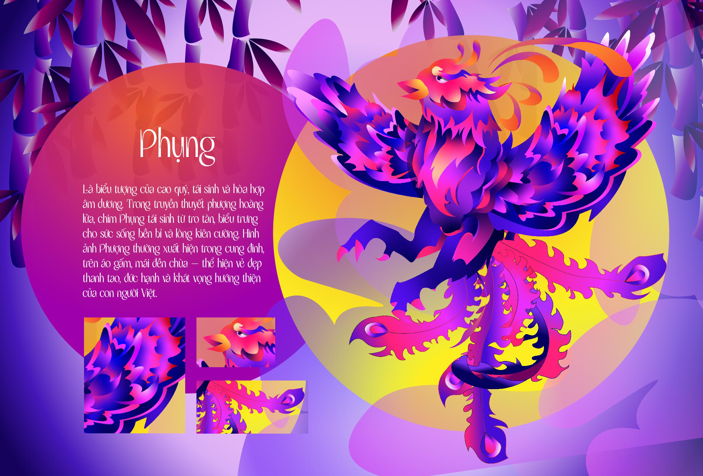 Tuy nhiên, để mang cho Tứ linh một diện mạo mới, mình đã chọn một hướng tiếp cận hiện đại. Bắt đầu bằng việc phác thảo và đơn giản hóa các chi tiết rồng, lân, rùa và phượng để giữ lại tinh hoa và uy lực mà không bị gò bó bởi khuôn mẫu cổ điển. Khi đi vào quá trình lên màu, mình đã áp dụng các gam màu neon rực rỡ, phá cách và gradient, tạo nên sự tương phản mạnh mẽ.