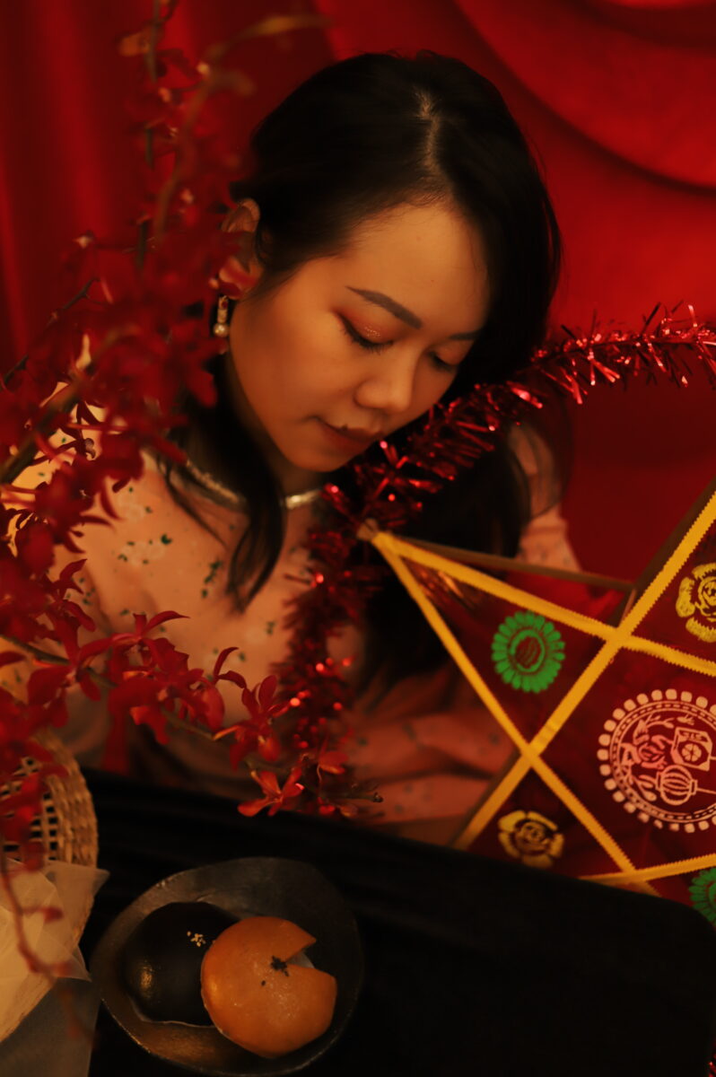 Đối với việc dựng concept, mình đã tận dụng khoảng không gian trong nhà, dùng những tấm voan, vải để tạo phông nền và hiệu ứng chụp. Đầu tư thêm lồng đèn và một số chi tiết nho nhỏ khác để mang đến không khí gần gũi nhất có thể.