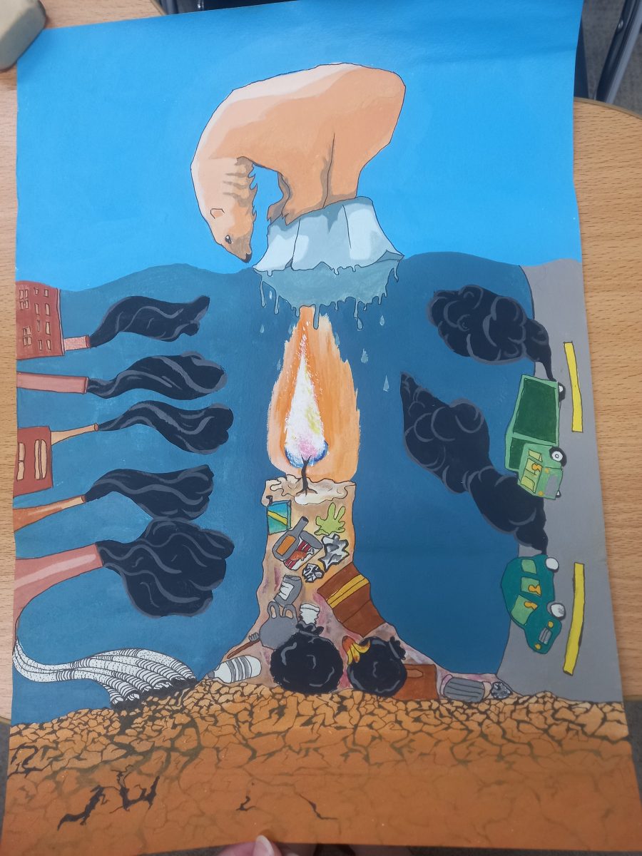 Nến không chỉ đem lại ánh sáng mà nó còn là ngọn lửa thắp lên niềm tin, đem lại tình yêu và hy vọng cho mọi người nhưng khi đặt một cái cây vào đó lại thể hiện được sự le lói của môi trường hiện nay. Thân nến là sự kết hợp của rác thải nhựa tạo thành đã làm cái cây chìm trong ngọn lửa để rồi làm cho khí hậu nóng lên gây ra hiện tượng băng tan chảy khiến cho những sinh vật sống ở đó dần mất đi nơi ở. Sự nóng lên toàn cầu không chỉ do khói độc từ các nhà máy thải ra mà còn khí thải của các phương tiện đi lại làm trái đất dần nóng lên và cạn kiệt nước. Chính vì chúng ta đang sống trong một môi trường bập bênh đang dần bị hủy hoại thì ta càng phải tự mình ý thức được mình phải làm gì để bảo vệ không khí xanh nơi ta ở.
