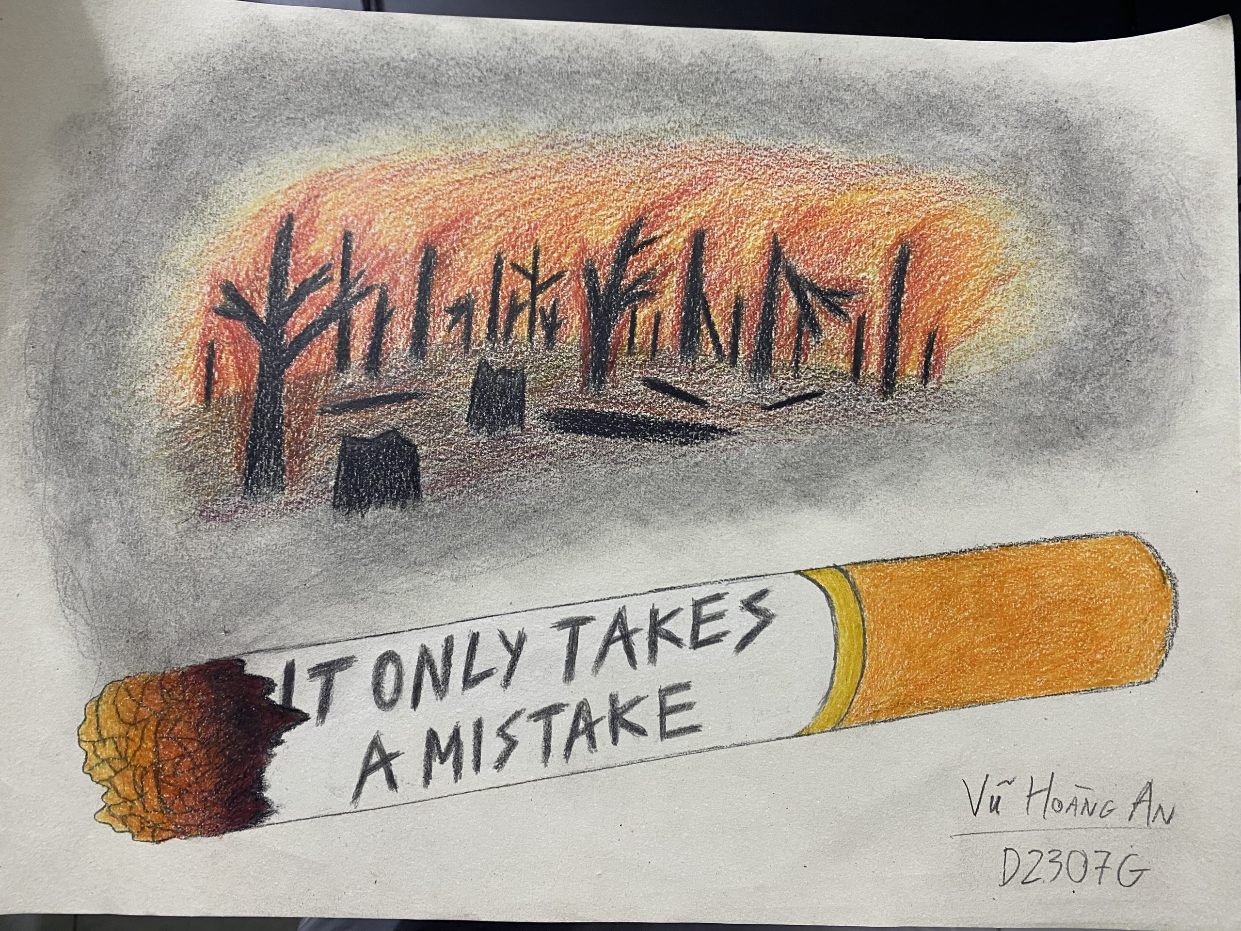 Thuốc lá – tưởng chừng chỉ là một vật thể nhỏ, nhưng nó lại là một trong những nguyên nhân phổ biến nhất gây nên nạn cháy rừng trên thế giới. Cũng như tiêu đề tác phẩm – It only takes a mistake, chỉ cần chúng ta mắc một sai lầm nhỏ chẳng hạn như vứt thuốc lá bừa bãi trên thảm cỏ thay vì vứt vào thùng rác, và rồi những tàn thuốc, những đốm lửa nhỏ có thể gây nên thảm họa cháy rừng nếu chúng ta không để ý.