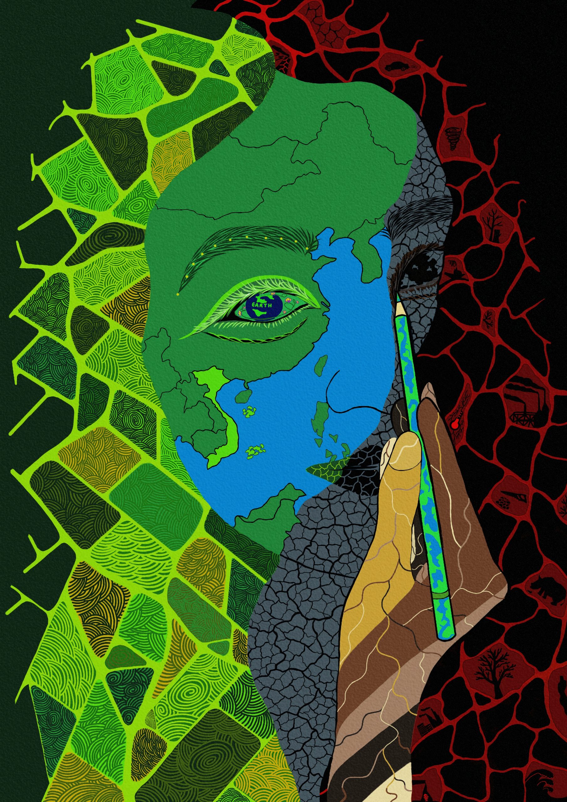 Cuối cùng là bàn tay nâng niu chiếc bút vẽ, năm màu da trên năm ngón tay tượng trưng cho hình ảnh gắn kết hòa hợp của năm châu, cùng chung tay để xây dựng và vẽ nên một thế giới sống, gìn giữ cội nguồn xanh, gắn liền với câu nói “Bàn tay ta làm nên tất cả”. Với Hoàng nó không hẳn được gọi là bức vẽ, vì chưa bao Hoàng vẽ như thế này cả, mà nó chính là sự ghép nét từ cảm quan hằn trong suy nghĩ của Hoàng khi trực diện nhìn vào thế giới. Có lẽ từ những mảng bố cục và màu sắc rối mắt sẽ tạo ra một cảm giác khó chịu khi xem. Nhưng thay vì cố gắng khiến cho nó hoàn hảo và hòa hợp giữa hai sự tương phản thì bản thân Hoàng nghĩ chính hiện thực về những điều không hoàn hảo mà con người trực tiếp nhìn thấy mới thật sự chạm được đến lòng trắc ẩn, kích lên cái khao khát tạo dựng và biến hóa mọi thứ trở nên tốt đẹp hơn. Bản thân Hoàng hy vọng, nửa mảng xanh còn lại sẽ được đặt bút vẽ từ tất cả mọi người.