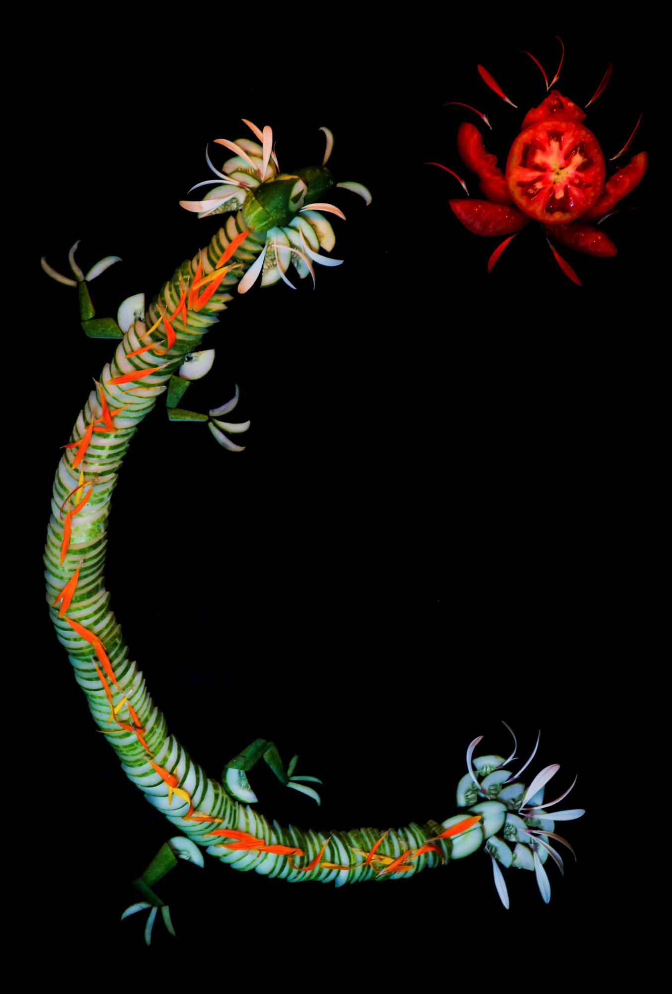 Ban đầu mình định tạo hình và chụp những quả dưa chuột theo kiểu khác nhưng kết quả lại không đạt được như mong muốn. Và với những “tàn tích” còn lại, mình quyết định tận dụng lại chúng để không lãng phí và trong những lần “thử nghiệm” mình đã nảy ra ý tưởng tạo ra một “chú rồng”. Một chiếc khăn đen được mình sử dụng bên dưới để làm nền, nhằm làm nổi bật chủ thể, và với điều kiện thiếu ánh sáng khi ở trong phòng, mình đã sử dụng một chiếc đèn bàn với ánh sáng vàng trắng làm nguồn sáng chính chiếu vào chủ thể. Bên cạnh đó mình cũng dùng một chiếc đèn bàn với ánh sáng vàng nhẹ chiếu vào phần đầu và ngọn lửa “cà chua”, nhằm làm nổi bật phần đầu rồng cũng như thể hiện một “lớp phủ” màu nóng – thể hiện sức nóng tỏa ra từ “ngọn lửa”. Từ đó có thể thấy được hai phần tương phản: Phần đầu rồng khi tiến đến gần đến “ngọn lửa” sẽ có cảm giác “nóng” hơn phần đuôi rồng – cách xa “ngọn lửa” sẽ có “lớp phủ” với tông màu lạnh hơn.