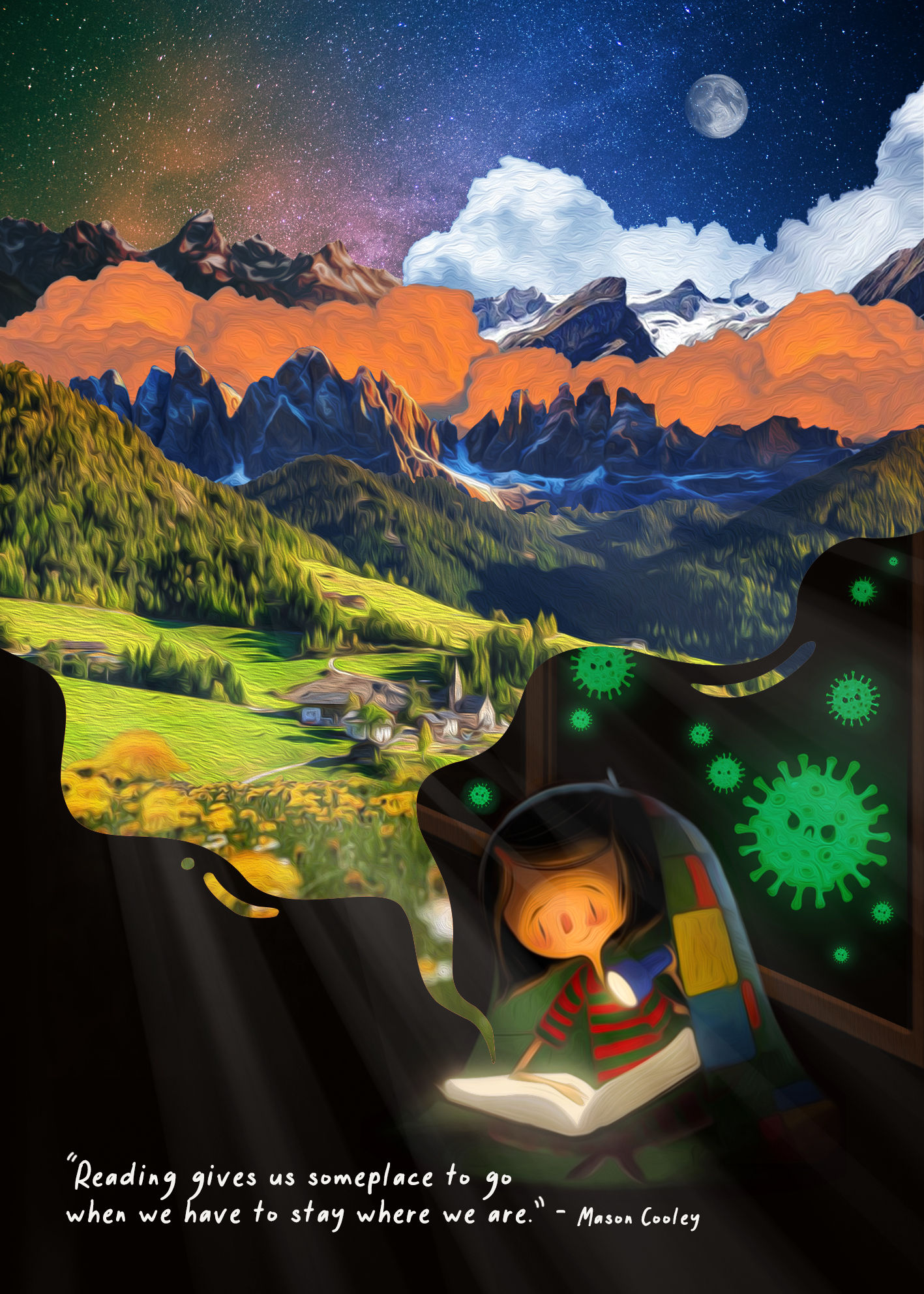 Tác phẩm của mình được lấy cảm hứng từ câu chuyện trên và câu nói của Mason Cooley “Reading gives us someplace to go when we have to stay where we are” để thể hiện tinh thần “Green your mind” qua lợi ích của việc đọc sách.