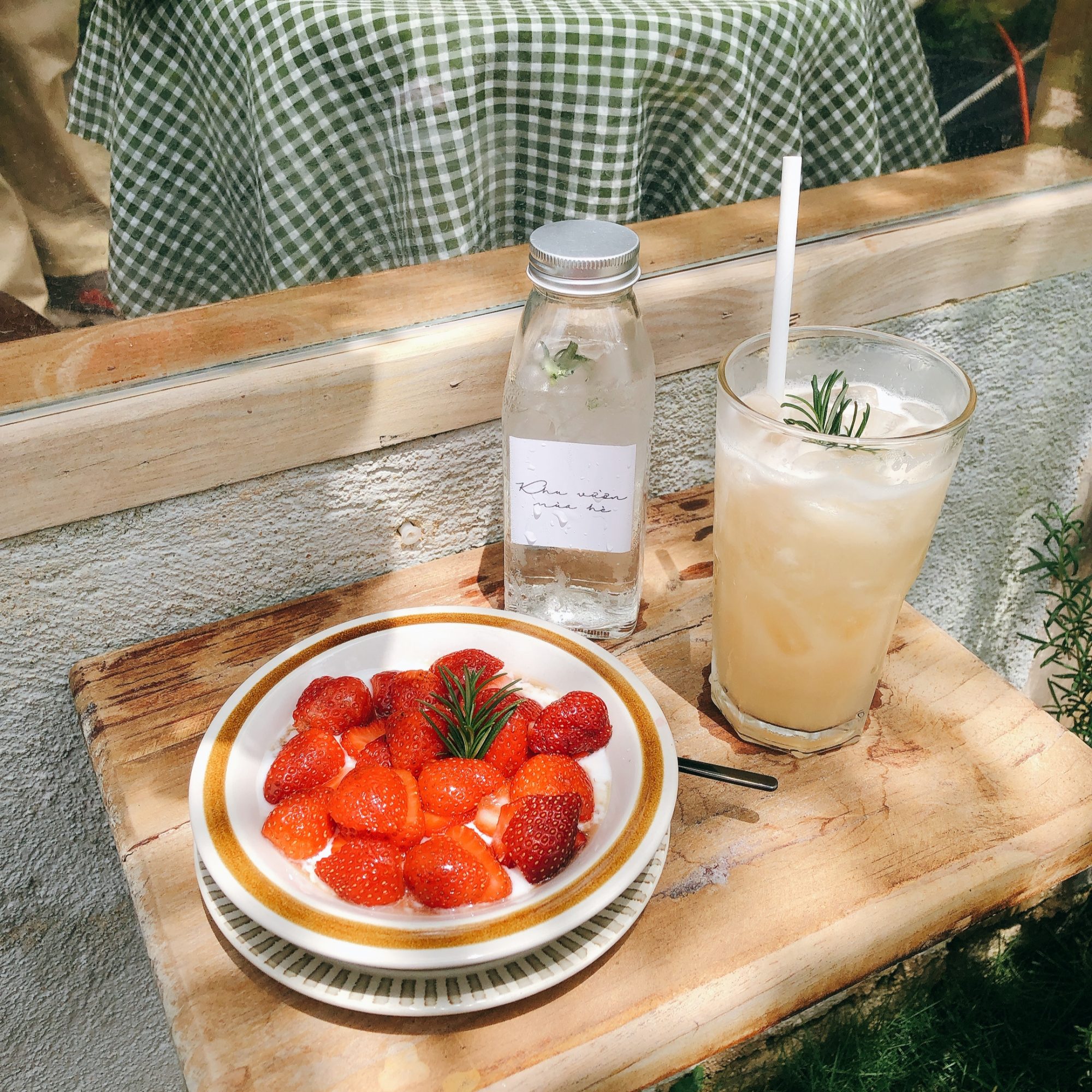 Dâu tươi yogurt và nước ép bưởi không đường (hình này em chụp ở quán nha quý dị).