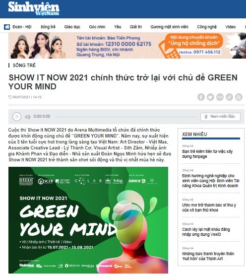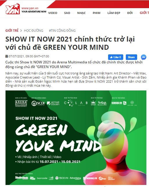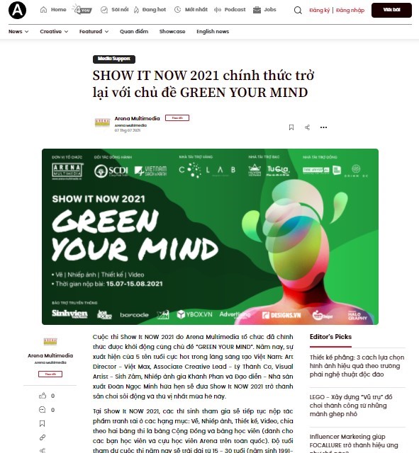 Khi nói về hiệu ứng truyền thông của Show It NOW 2021, trong 3 tháng cuộc thi diễn ra, website chính thức của Show It NOW ghi nhận hơn 172 nghìn lượt pageview, trong khi đó tài khoản Facebook đã cán mốc 1,4 triệu người tiếp cận. Tin tức về cuộc thi Show It NOW 2021 phủ sóng trên 13 trang tin tức lớn nhất cả nước và hơn 70 trang báo mạng tiếng tăm, nhận được lượt tiếp cận lên đến con số 6 triệu vô cùng ấn tượng. Chưa dừng lại ở đó, chủ đề Green Your Mind năm nay còn nhận được sự quan tâm của các chuyên gia trong ngành sáng tạo, được chia sẻ và đề cập rộng rãi thông qua các bài đăng mạng xã hội sở hữu lượng tương tác dồi dào. Bấy nhiêu cũng đủ để thấy được sự thành công của cuộc thi Show It NOW năm nay. Arena không thể nói gì hơn ngoài sự biết ơn đối với những tổ chức và cá nhân đã nhiệt tình hỗ trợ cuộc thi truyền tải thông điệp “xanh” đến với nhiều người hơn.